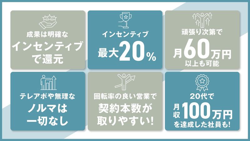 給与 | 年俸3,716,800円~20,000,000円 給与詳細 基本給:年俸 371万6800円 〜 2000万円 固定残業代:あり 【一律手当】 全員に一律で支払われる通勤・皆勤・家族手当金額:なし 全員に一律で支払われるその他手当金額:なし 月給 22万4200円 〜+インセンティブ(10万~100万以上) 給与にはみなし残業手当23,600円(17時間分が含まれます)※超過分は別途お支払いいたします。 幹部候補生同時募集! 【インセンティブ】 月平均支給実績:10万円~60万円以上 成果は1円単位でダイレクトに給与へ反映 年収2000万円クラスの社員も実際に在籍中! 当社のインセンティブ制度に「上限」はありません。 記載している金額はあくまで平均的な目安であり、 成果次第でどこまでも収入を伸ばせる環境です。 ※詳細な還元率や計算方法については、 面談・面接時にお話しします。 ━━━━━━━━━━━━━━━━━━━━ 【給与例】 給与例 一般社員/入社3ヶ月目(新卒) 月給23万1500円+インセンティブ11万円 =月収34万1500円 リーダー/入社2年(中途・27歳) 月給23万1500円+インセンティブ51万2000円 =月収74万3500円 所長/入社2年6ヶ月 月給41万5000円+インセンティブ96万3579円=137万8579円 ━━━━━━━━━━━━━━━━━━━━ ✨社員インタビュー✨ 元医療事務の経験から、 安定した収入とワークライフバランスを求めて転職しました。 入社後は、2ヶ月で月収49万円を達成し、 3ヶ月でサブリーダーに昇格。 自分の頑張りが評価される環境と、 頼れる仲間とのチームワークが魅力です。 今後は月収を倍にすることを目標に、 家族とより豊かな生活を送りたいと考えています。 ━━━━━━━━━━━━━━━━━━━━ |