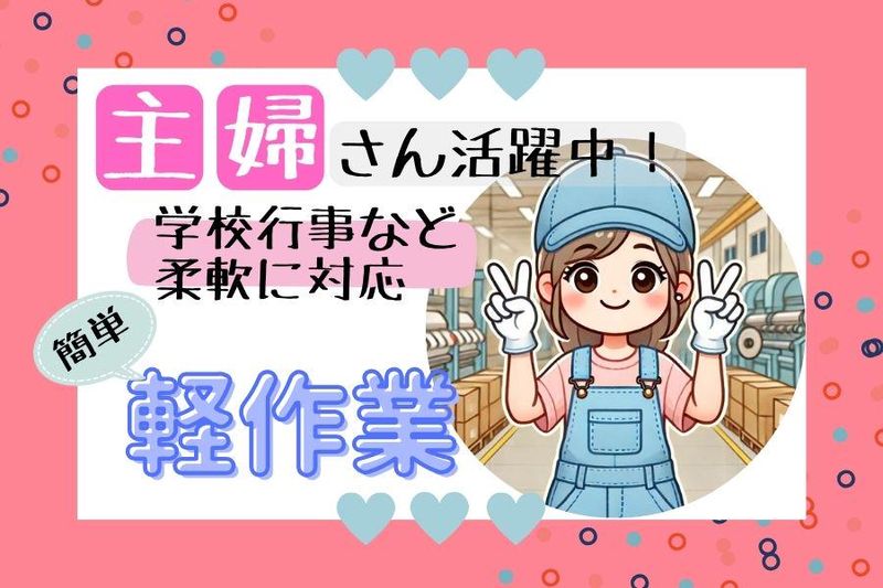 職種/仕事内容 | 仕事内容 \経験不問◎シンプル&もくもく軽作業/ お任せするのは、住宅用の雨どい部品の最終検査と出荷準備。 難しい作業や重い荷物はなく、体を動かすのが得意な方、細かいチェックが得意な方にぴったり。 未経験でも、業務中にすぐ相談できる体制が整っているので安心してスタートできます。 【具体的な業務内容】 ◆ 外観検査 → 雨どいの連結部品や付属パーツを一つずつ手に取り、キズ・汚れ・不具合がないかを目視で確認します。 ◆ 梱包作業 → 最終チェックを終えた製品を、指定数量ごとにまとめて梱包します。 ◆ ラベル貼り → 製品情報が記載されたラベルを貼り付け、出荷準備を行います。 【よくあるご質問(Q&A)】 ~未経験スタートも安心♪よくあるご質問にお答えします~ Q. 工場勤務は初めてですが、大丈夫でしょうか? A. 大丈夫です!作業中に困ったときはすぐに相談できる指導体制がありますので、初めての方も安心して始められます。 Q. どんな方が活躍していますか? A. 女性スタッフが多数活躍中。細かい作業が得意な方や、立ち作業に慣れている方が多いです。 Q. 体力的に厳しいことはありますか? A. 重い物は扱いませんが、立ち作業中心のため、ある程度体を動かすのが苦にならない方に向いています。 Q. 子どもの行事などで休みがとれるか心配です。 A. 学校行事への配慮あります!事前に相談いただければ、柔軟に対応可能です。 Q. 休憩はしっかり取れますか? A. お昼休憩とは別に、10分程度の休息タイムが午前・午後にあります。体をリフレッシュしながら働けます。 |