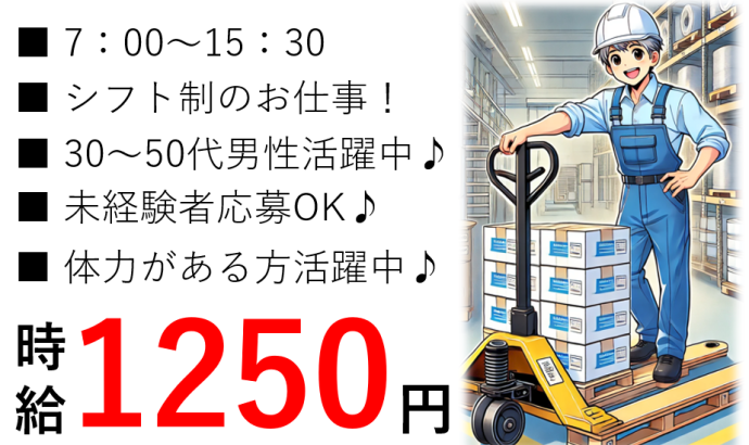 職種/仕事内容 | 仕事内容 【製品包装作業員】 ◎包装用フィルムを 製造している工場内で 下記業務を行っていただきます! ・製品の出荷前包装作業 ・ハンドリフトを用いた製品運搬作業 ・パレットに製品を乗せ換える作業 ※フォークリフト免許を お持ちの方は作業を伴います。 ※30キロ以上の 重量物の取り扱いがあります。 ※2交代での勤務体系です。 ○製造工場の倉庫において 未経験の方でも 活躍できる包装作業のお仕事です! ○ラインから流れてきた フィルム製品に 出荷できるように簡単な検査と 出荷できる状態に 包装作業を行います! 〇高時給案件! 高時給+残業で稼げます! ※残業は強制ではありません 〇重量物を取り扱う お仕事になりますので 体を動かすことが好きな方大歓迎♪ ■■■ここもチェック!■■■ ◇有資格者活躍中 ◇フリーター活躍中 ◇ブランクOK ◇長期 ◇残業月20時間以下 ◇友達と応募OK ◇家庭都合休OK ◇40代スタッフ活躍中 ◇50代スタッフ活躍中 ◇学歴不問 ■■■■■■■■■■■■■■ |