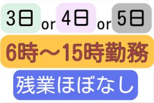 勤務時間 | 固定時間制 勤務時間 6:00~15:00 または 6:00~11:45 |