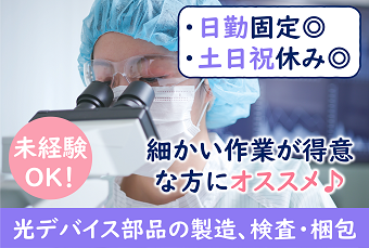 職種/仕事内容 | 仕事内容 【時給が100円UPしました!】【人気の本厚木エリア】未経験者歓迎!電子部品の検査をお願いします!日勤&土日祝休み♪快適環境でお仕事しませんか? <仕事内容> クリーンルームにて通信機器や医療機器等で使用される小さい部品の製造・検査等をお願いします! 具体的には、顕微鏡を覗いて部品に傷が無いか汚れが無いかの検査だったり、小さい部品をピンセットで組付けていただく等々。 いきなりこれらの作業を任せるのではなく、しっかりと慣れるまでは社員の方や先輩がサポートしてくれるので未経験の方でも安心して就業出来ます! 立ち作業・座り作業どちらもございます。 クリーンルーム内作業です。 アピールポイント <仕事内容> クリーンルームにて通信機器や医療機器等で使用される小さい部品の製造・検査等をお願いします! 具体的には、顕微鏡を覗いて部品に傷が無いか汚れが無いかの検査だったり、小さい部品をピンセットで組付けていただく等々。 いきなりこれらの作業を任せるのではなく、しっかりと慣れるまでは社員の方や先輩がサポートしてくれるので未経験の方でも安心して就業出来ます! 立ち作業・座り作業どちらもございます。 クリーンルーム内作業です。 \充実した福利厚生/ ◎社会保険・雇用保険完備 ◎有給休暇有(6ヶ月経過後、10日付与)※規定あり ◎残業手当 ◎交通費支給(規定内) ◎確定拠出年金制度 ◎週払い制度(週3回対応) ◎お友達推薦制度あり(規定有り) ※1名につき3万円~10万円臨時給与として支給 ◎車(マイカー)・バイク通勤可(無料駐車場あり) ◎制服貸与 ◎食事持参可 ◎社員食堂あり ◎正社員登用制度あり ◎福利厚生プログラム (宿泊、グルメ、ショッピングなど大幅割引が受けられる10万アイテムのメニューがあります。) |
