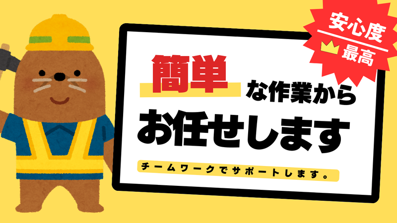 対象となる方 | 求めている人材 ✅学歴不問 ✅経験不問 ✅未経験OK おかげさまで数多くの取引会社様に お付き合い頂いており、 仕事に困ることもなく仕事量も 安定しております。 車両系建設機械を運転できる方も大歓迎です! - 新スタッフ随時募集中! 今回採用率99%!本気で積極採用中! アナタの希望の働き方をお教えください! どんな応募理由でもアナタの生活を サポートします! 欲しいものや夢に向けてガッツリ 稼ぎたい人にピッタリ! 働きながら筋トレしたい方もOK! 過去の職務経歴・学歴・経験一切不問! 髪色・髪型・ヒゲ自由! お気軽にご応募下さい! 【下記のような経験ある方からも応募頂いています】 ・飲食店でのキッチン ・介護福祉関連 ・内装解体 ・リフォーム工事関連 ・舗装会社関連 ・建築業関連 ・交通誘導・警備員 ・スポーツ関連職 ・引っ越し作業 ・物流倉庫での仕分ピッキングなど |
