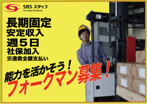職種/仕事内容 | 仕事内容 注目案件/おススメのお仕事/フォーク作業/長期固定のお仕事 有名ブランドシューズを、リーチフォークで入出庫・運搬などの作業をお願いします。 また、荷物の検品などの手作業もお願いします。 1日の割合としては、フォーク作業6に、手作業4といった形になるかと思います。 月間で20時間程度の残業もお願いする事となるかと思いますので、ガッチリ稼ぎたい方におススメのお仕事です。 月収26万以上となります。 ぜひ、長期固定で働きたい方、ご応募をお待ちしています! ・休憩室完備/冷蔵庫・電子レンジ・湯沸し器完備 ※お弁当を温めてお食べいただけます。 ・個人ロッカー完備 ・洗面所男女別完備 ・通勤は、最寄り駅から徒歩18分ほどの場所 ※マイカー・バイク・自転車通勤OK! ※交通費実費支給!車・バイク通勤の方では、ガソリン代を支給 ・屋内原則禁煙(喫煙スペースあり) その他 ※残業は、月で20時間程度 ※有給休暇取得しやすい ※事前の休み調整相談可 ※長期勤務で、当社社員への登用あり [こんな人が活躍] 黙々と出来る方が活躍中! |