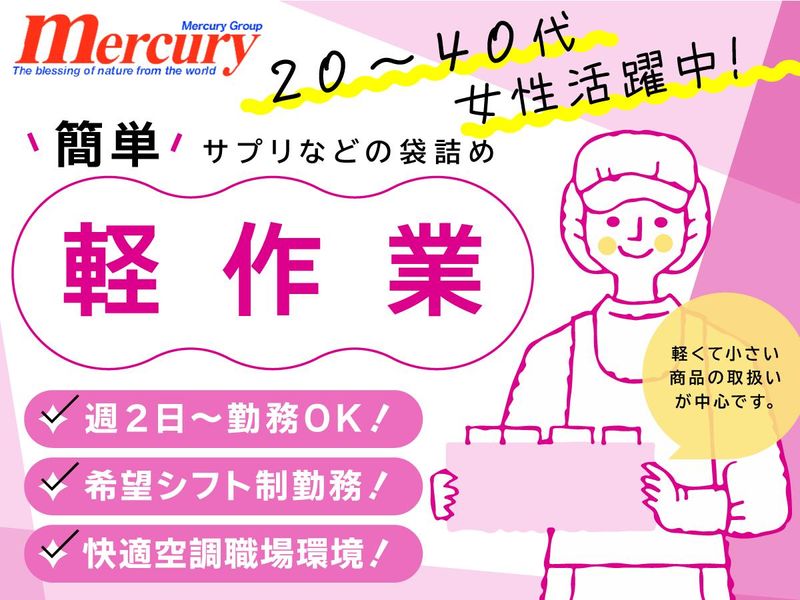 職種/仕事内容 | 仕事内容 ・-・-・当求人のアピールPoint・-・-・ *経験不問&ブランクOKの簡単軽作業 *休憩多め&チーム作業で初心者も安心 *土日祝休み!平日のみ週2日~勤務OK *30代・40代女性&子育てママ在籍中 *明るく和やかな雰囲気で人間関係良好 ・-・-・-・-・-・-・-・-・-・-・-・-・ 【仕事内容】 ・商品の袋詰め ・パック詰め ・梱包 など 慣れてしまえば単純な作業ばかり! 重量物の運搬など力仕事はありません* 【取扱い商品例】 健康食品やサプリメントなど 【未経験でも働きやすい】 ❏5名程度のチームで作業! →協力体制バッチリでチームワーク抜群 ❏商品は軽くて小さい! →簡単作業ですぐに慣れることができます ❏午前・午後にこまめな休憩有! →立ち仕事でも集中しやすい環境です 【スタッフについて】 子育て中&子育てが一段落したママさんなど 30代・40代の主婦さん中心に活躍中! 全スタッフが未経験スタートですが、 全員がチームの一員として欠かせない存在* ~休憩スペース完備~ 昼食時にはお弁当を囲んで 話が盛り上がる時も多く、 風通しの良さがこの職場の特徴! いつも和気あいあいとしていて 温かみが感じられます* 【こんなお仕事をお探し中の方にも】 ・工場や倉庫内作業 ・検査やピッキング、仕分けや入出庫作業 ・商品管理や在庫管理 ・集配、集荷作業 ・物流作業 ・夜勤なしの工場作業員 【株式会社マーキュリービス】 *創業32年を迎える安定企業 *健康食品や美容食品の製造・販売業 *http://www.mercury-sho.net/ |