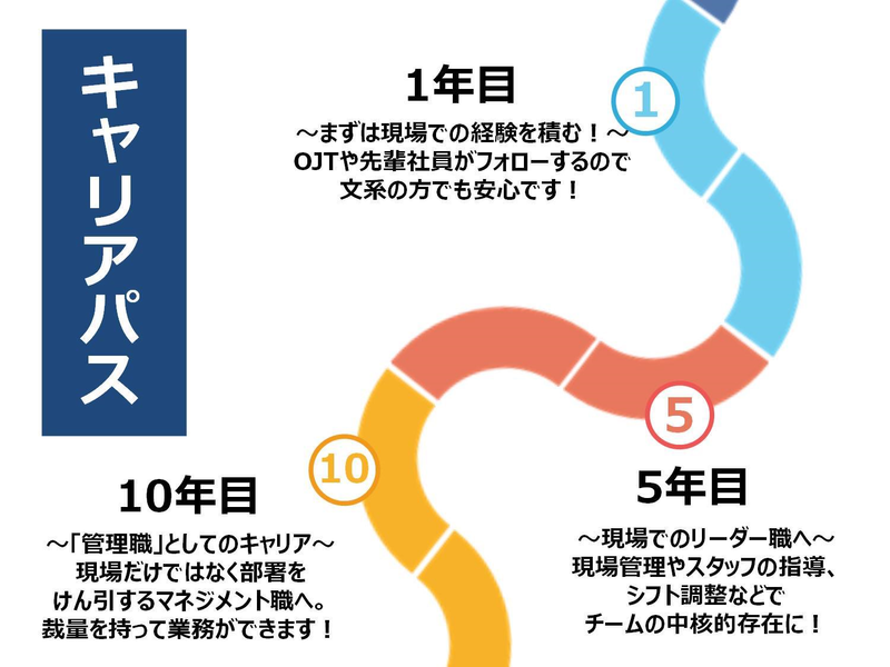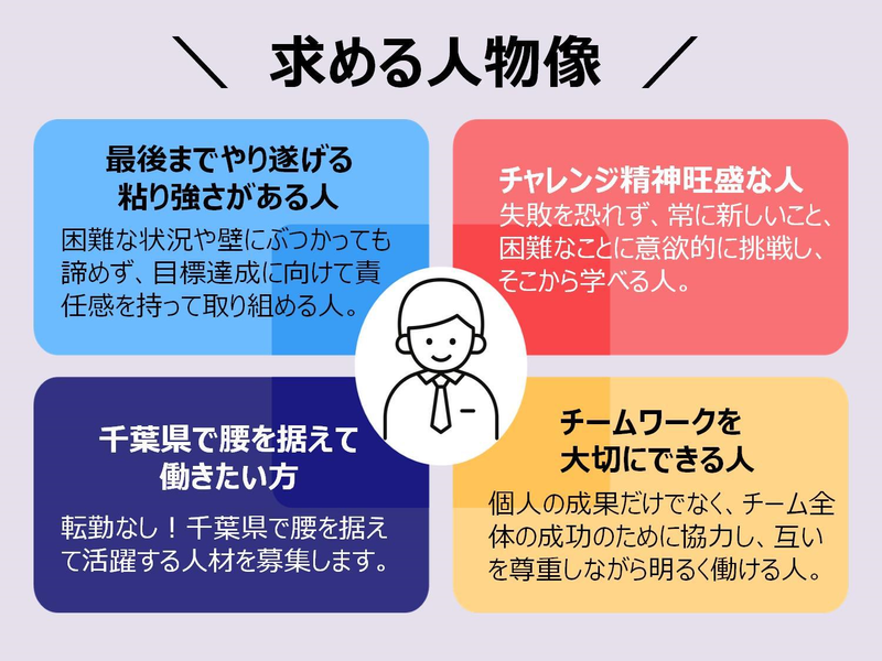 対象となる方 | 求めている人材 ☆最後までやり遂げる粘り強さがある人 困難な状況や壁にぶつかっても諦めず、目標達成に向けて責任感を持って取り組める人。 ☆チャレンジ精神旺盛な人 失敗を恐れず、常に新しいこと、困難なことに意欲的に挑戦し、そこから学べる人。 ☆千葉県で腰を据えて働きたい方 転勤なし!千葉県で腰を据えて活躍する人材を募集します。 ☆チームワークを大切にできる人 個人の成果だけでなく、チーム全体の成功のために協力し、互いを尊重しながら明るく働ける人。 年齢の条件と理由:あり(例外事由3号のイ・27歳未満(長期勤続によるキャリア形成のため)) |