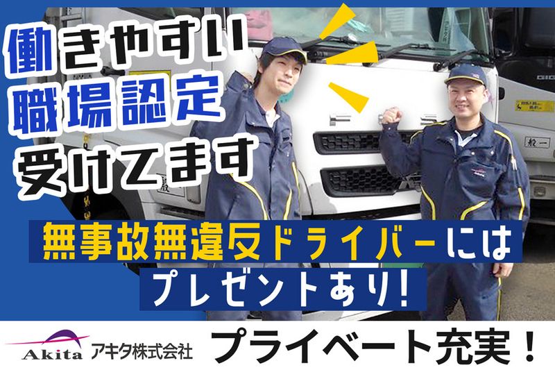 【アピールポイント】 創業80年を迎え、従業員数1050名、保有台数770台超え。 全国に27拠点ある大手物流会社、それが私たちアキタ株式会社です。 【10tトラック運転手募集!】 ▶働きやすい職場認定「二つ星」を受けています✨ ✅月給35万円~50万円、賞与あり ✅未経験OK・手厚い研修制度あり ✅無事故無違反ドライバーにはプレゼントあり
