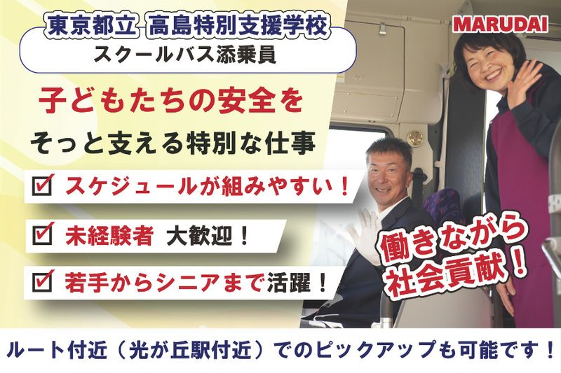 職種/仕事内容 | 【仕事内容】 ■仕事内容 特別支援学校のバス添乗員として、生徒様を送迎補助していただきます! \特別支援学校のバス添乗員の働きやすさ/ ◇スケジュールが決まっている◇ 送迎スケジュールはもちろん、学校の予定に合わせてお休みも決まっています! ◇毎日同じルートで運行◇ 観光バスのような異なるルートはありません!一度覚えてしまえば楽々です! \現在募集中のルートはこちら/ ・高島特別支援学校 住所:東京都板橋区高島平3丁目7−2 お近くにお住まいの方は、運行ルート付近(光が丘駅付近)でのピックアップも可能です。 ■1日の流れ(例) (登校便) 7:00 各バス停を周り、生徒様を順番にお迎えします。 ↓ 9:00 学校に到着。生徒様を先生に引き渡します。 (下校便) 14:00 学校に到着。生徒様をお乗せし、各バス停を周ります。 ↓ 16:00 生徒様を全員送り届けたら送迎は終了です。営業所に帰庫します。 \スクールバスならではの休憩時間の使い方/ ◇休憩は5時間!使い方は自由!◇ ・ご自宅に帰って家事や趣味の時間に充てる ・平日昼でも役所や病院/歯医者へ ・布団を持ち込んでお昼寝 ・近くのスポーツジムでトレーニング ・Wワークで副業も自由 ■活かせる資格・経験 経験は一切問いません!どなたでも未経験からスタートできるお仕事です! 生徒さんとの関わり方は学校と保護者の方が特性に合わせて決定します。 個人個人に合わせた対応が得意な方におすすめです! ■こんな方におすすめ ◇年齢を気にせず働きたい方◇ ・若年層から中高年シニアの幅広い世代が活躍中! ◇時間を確保したい方◇ ・決まったスケジュールで、家庭との両立をしやすい! ・夏休みや冬休みなど、お子様の休みに合わせた休暇をとれる! ◇好きなことに関わりたい方◇ ・生徒さんや親御さんの笑顔/成長を見届けられる! ・元保育士で子どもが好き、元看護士で誰かの力になりたいなあなたに! ◇地元が好きな方◇ ・転勤なく、地元で働き続けることができる! ・決まった近隣エリアのみの運行で、地域に密着! ■入社後の流れ <1日目> まずは座学や動画マニュアルで、業務内容をじっくりと理解していただきます。 ※状況に応じて、午後の下校便に実際に同乗し、業務を見学いただく場合もあります。 <2日目~6日目> 専任の指導員がサポートしますので、実際に業務をこなしながら、仕事に慣れていただきます。 <7日目以降~> 正式に添乗員として、現場での業務をお任せします。 ■働きやすい環境づくり ◇賞与は年2回支給◇ ◇転勤なし◇ 転居を伴う(県をまたぐ)異動は一切ありません!入社時に希望の拠点をお伝えください。 ■安全への取り組み 命を預かる事業者として安全性の向上へ日々取り組んでおります! ◇最新設備の導入◇ 最新の安全技術、PCS、VSC装備車両を随時導入して 走行状態を検知して危険を抑止しています。 ◇健康チェック◇ ドライバーの睡眠時無呼吸症候群の可能性を事前にチェックして 安全運行に役立てています! =================== 創業102年 ~大正生まれの実績と伝統ある企業です~ 長い歴史と伝統がある当社ですが、新しい風も常に取り入れています! 安全への取り組みも積極的! 風通しの良い職場なので ぜひあなたの意見などもどんどん聞かせてください。 一緒に「より良い会社」にしていきましょう! =================== \まずはお気軽にご応募ください/ ご経験の活かし方や、ライフスタイルに合わせた働き方などまずはご相談ください! 少しでも気になったら、ご応募をお待ちしております! ★リファラル採用実施中★ 知人や友人を紹介し、採用が決定すると、 紹介者に10,000円、入社者にも10,000円を支給します! |