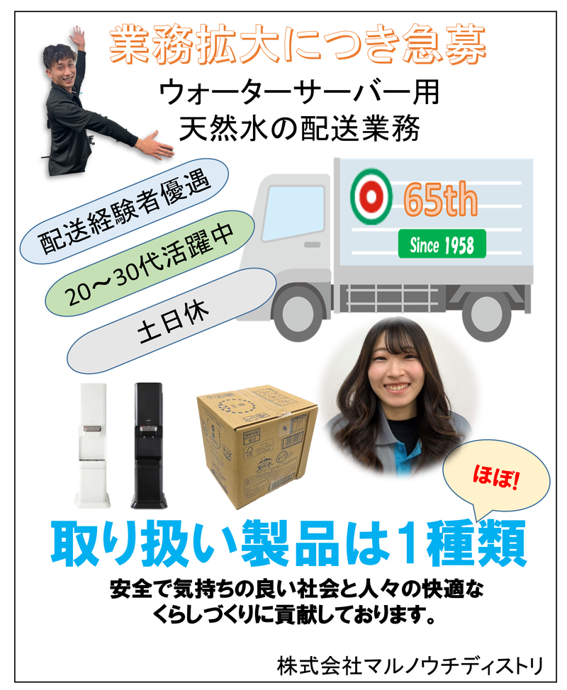 職種/仕事内容 | 仕事内容 ✅普通免許だけでOK!資格取得支援あり ✅未経験からスタートしたスタッフ多数 ✅賞与年3回!年間60万円支給実績あり ✅完全週休2日制でメリハリ良く働ける♪ 未経験スタート&入社1年目で年収300万円超えのスタッフも在籍◎ 契約企業や店舗にウォーターサーバー用の「水」をお届けする仕事!働きやすさ抜群の配送ドライバーです。 《具体的には…》 「サントリーの天然水」を各契約企業・店舗に配送していきます! お届け先はあなたの担当先のみ!定期的に訪問するため、まずは顔を覚えてもらうところから始めていきましょう。 \ 仕事の流れ / 台車を使い商品を指定場所へ搬入! (10リットル入りの25㎝段ボール箱) ▼ ウォーターサーバーの簡易清掃 上記業務を繰り返していきます。 1日の対応件数は10件~15件ほど。 東京北支店以外にも東京23区内・埼玉県・新潟県に勤務地あり! 他に希望があれば優先いたします。 「自宅から近い勤務地が良い」「Iターン・Uターン希望」「入寮希望」などもOK! ※都内ワンルームマンション個人寮あり ・………………………………………・ \ 1日のタイムスケジュール例 / 【8:00~】出社・朝礼 ルート確認・連絡事項の共有 ▼ 【8:30~】配送スタート ▼ 【9:00~】10件配送 ▼ 【11:45~】早めの昼食・休憩 ▼ 【13:00~】10~15件配送 お得意先の会社様で世間話など♪ ▼ 【16:45~】帰社後、翌日の準備など ▼ 【17:00】仲間と軽く談笑し、退社 ・………………………………………・ ╭━━━━━━━━━━━━━━╮ 未経験スタート多数!定着率◎ ╰━v━━━━━━━━━━━━╯ 未経験からスタートした若手スタッフも多数活躍中!普通免許さえあれば始められるドライバー。 商品のこと、お客様への丁寧なお届け方法、安全運転方法など、先輩がしっかり教えます。 資格取得支援制度や各種研修を設けており、スキルアップも可能! 未経験から始めた先輩が多いから、新人へのサポートも手厚いんです♪ ╭━━━━━━━━━━━━━━╮ 手厚い福利厚生✨賞与は年3回 ╰━v━━━━━━━━━━━━╯ 賞与の合計支給額は、昨年度で年間60万円!入社して間もない方でも安定収入が見込めますよ。 スタッフには安心して働いてほしいから、結婚・出産祝い金や、年間無事故手当、各種研修制度など福利厚生の整備に力を入れています。 ╭━━━━━━━━━━━━━━╮ 詳しく知りたい方はチェック! ╰━v━━━━━━━━━━━━╯ 当社の社内イベントなど更新しております★ https://www.dist.marunouchicorp.co.jp/topics/ 事業内容や企業情報はHPでご覧ください! https://www.dist.marunouchi-corp.co.jp/ |