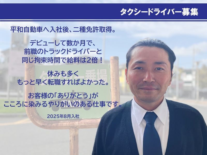 職種/仕事内容 | 仕事内容 平和自動車は1951年に北浦和で創業したタクシー会社。弊社のタクシー車両が昼夜問わずさいたま市内を駆け巡っています。 タクシー不足が深刻だった2024年頃。日本型ライドシェアがさいたま市内で認可され、タクシーと合わせてよく見かけるようになりました。 しかしながら、市民ドライバーへの不安感を口にするお客様も多くいらっしゃいます。 本来のタクシー会社の使命を果たすべく、タクシー車両の供給量を最大限に保っておりますが、さいたま市内では珍しく、タクシー車両の増車することができ、新たなタクシードライバーの採用枠が増えました。 未だに昼夜問わずタクシー不足が続いています。配車アプリの浸透によって新しい客層の利用者も増大し、当社に限らず豊富な仕事量に圧倒され続けています。 タクシーの仕事は「待つこと」が仕事と言われて久しいのですが、今となっては「仕事を止めて帰ること」が求められている現状です。 時間管理が厳しい運転業務の宿命ですが、乗りたいお客様がいても、それを尻目に帰らなければならない為、より一層の車両稼働が求められています。 【タクシードライバーの仕事】 タクシードライバーの仕事は、お客様を安全に目的地までお送りすることです。お客様とのコミュニケーションや、地理の知識が大切になります。 ◆勤務形態と働き方 タクシー運転手には、主に二種類の勤務形態があります。自分のライフスタイルに合わせて選べます。 ===隔日勤務=== 1日働くと、次の日はお休みです。 体力は使いますが、まとまった休みが取れます。 ===昼日勤・夜日勤=== 昼間だけ、または夜間だけの勤務です。 生活リズムを整えやすいのが特徴です。 この求人記事は「隔日勤務」に沿った募集です。 ◆乗務について 冒頭でも申した通り、タクシーを利用したい方を目的地までお送りします。 お客様を探し回る「流し」はありません。 <営業エリア> 平和自動車の営業エリアはさいたま市内。特に京浜東北線や埼京沿線の各駅の乗降客を中心にお世話します。 大宮駅周辺から浦和駅周辺までのエリアが主な活動範囲です。 <お客様を探す> 次の3つの方法でお客様を獲得します。 ◇JR各駅のタクシープールで他社のタクシーと順番を待つ ◇会社からの配車指示を待つ(主に移動中) ◇配車アプリからの指示を待つ 全て受け身の営業方法です。空車になったら、担当する駅の乗場へ戻ります。 戻る途中で配車指示やアプリからの要請が飛び込んでくることが大半です。 ・1日の営業は25~30回、30~40人程度をお乗せします。 ・支払は現金以外にクレジットやQRコードなど多岐にわたります。 ・荷物が多い場合はトランクサービスも必要。 たまに、都内をはじめ県外に行くこともありますが、カーナビを使って目的地を目指すので、地理が解らなくても仕事が成立しますので安心してください。 地理が解れば、より高効率に仕事ができ、収入にもメリットが出てきますが、最初からできる人はいません。 経験を重ねて地理を覚えていきます。 日中は高齢者や傷病者の通院・通所、買い物目的に対応します。 夜間になると企業の接待などに利用が多く、酔客も増えていきます。終バスや終電に遅れた人々や、大型病院へ搬送された救急患者の帰りの移動手段としての活躍も求められます。 各種冠婚葬祭などでも大切なお客様の送迎を要請されますので、お祝い事とお悔やみごとが入り混じることも有り、誠実な接遇を求められることが多いです。 ◆乗務以外の業務 お客様を乗せている時間以外にも、様々な業務があります。 <洗車・清掃> お客様に快適に乗ってもらうために毎日行います。 <車両点検> 安全に運行するための大切な業務です。 <売上管理> 運行記録や売上を管理します。 <地理の学習> 効率よくお客様を送迎するために日々勉強します。 ◆タクシードライバーのやりがい 公共交通機関の中で、唯一、ドアTOドアの移動サービスを提供できるタクシーは、人々の生活に深く入り込む職種です。 ご利用になるお客様のほとんどが「ありがとう」の感謝の言葉を残して降車されます。やりがいを感じられる瞬間がたくさんあります。 ・未経験でも挑戦できる ・人と接する楽しさ ・様々な出会いがあります。 ・頑張りが収入に直結 ・売上に応じて給料が変わるため、やりがいがあります。 上司や組織の評価で給料が決められることに不安や不満を感じている方には、フィットする働き方ではないでしょうか? |