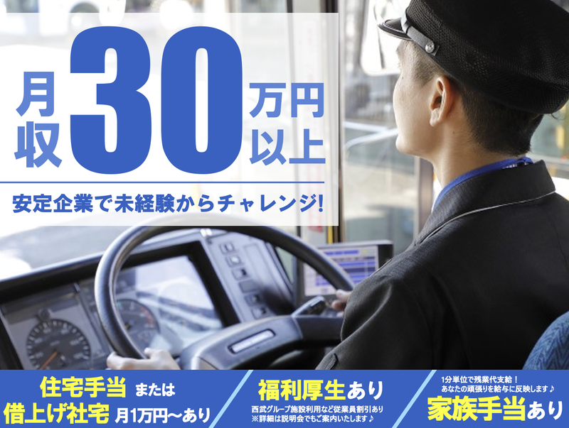 職種/仕事内容 | 仕事内容 ˚✧₊⁎ ⁎⁺˳✧༚˚✧₊⁎ ⁎⁺˳✧༚˚✧₊⁎ ⁎⁺˳✧༚˚✧₊⁎ ⁎⁺˳✧༚ 月4〜5回説明会開催中! お気軽にご参加くださいね♪ ˚✧₊⁎ ⁎⁺˳✧༚˚✧₊⁎ ⁎⁺˳✧༚˚✧₊⁎ ⁎⁺˳✧༚˚✧₊⁎ ⁎⁺˳✧༚ \この求人のおすすめポイント/ ◆月収30万以上可能◎ ※残業代も1分単位で支給! あなたの頑張りを給与でも反映します♪ ◆普通免許のみで応募OK!AT限定可! ◆家賃月1万円で借上社宅の利用可能!※条件あり ◆合宿免許で大型二種免許をゲット!もちろん会社が支援♪ ◆免許取得中も日給9,000円を支給! ◆健康経営優良法人でホワイトな働き方を実現! ◆西武グループの福利厚生がすごい! ˚✧₊⁎ ⁎⁺˳✧༚˚✧₊⁎ ⁎⁺˳✧༚˚✧₊⁎ ⁎⁺˳✧༚˚✧₊⁎ ⁎⁺˳✧༚ ◆かっこいい志望動機は不要です!◆ 自己アピールや面接が苦手、、、 自慢できる職歴がない、、、 そんな方もご安心ください♪ ・家が近かったから ・みんな知ってる会社だから ・親に勧められたから ・福利厚生が良さそうだから ・正社員になりたい 志望動機は人それぞれ。背伸びは必要ありません。 少しでも興味をお持ちいただけたこともご縁です。 まずは説明会に参加してみてください! 当社の魅力を存分にお伝えいたします。 ◆普通免許のみで応募OK!AT限定でもOK!◆ 大型免許を持っていない方は免許合宿に参加し 約2〜3週間で免許取得が可能です。 もちろん取得費用も会社が全額補助。 教習所での合宿中も日給9,000円支給します♪ ˚✧₊⁎ ⁎⁺˳✧༚˚✧₊⁎ ⁎⁺˳✧༚˚✧₊⁎ ⁎⁺˳✧༚˚✧₊⁎ ⁎⁺˳✧༚ 【ドライバーデビュー後の仕事内容】 ・バスの運行前点検 ・扉の開閉・運賃の収受 ・停留所の車内アナウンス ・忘れ物・不審物などのチェック他 ˚✧₊⁎ ⁎⁺˳✧༚˚✧₊⁎ ⁎⁺˳✧༚˚✧₊⁎ ⁎⁺˳✧༚˚✧₊⁎ ⁎⁺˳✧༚ 【アピールポイント】 ◆家賃が月1万円◆ 借上社宅が月1万円で利用可能です。 新生活をさまざまな面でサポートします。 ※社内規定あり ◆働き方も福利厚生も充実◆ 当社は健康経営優良法人2023を取得しました。 仕事以上にプライベートの時間も大切だと考えています。 心身ともに健康的に過ごしていただける環境を整えています。 また、福利厚生の一環として、 西武グループの各種施設が利用できるのもメリットです。 (スキー場、ゴルフ場、プリンスホテルの割引など) 福利厚生では西武グループ施設が従業員価格で利用可能です! 【利用できる施設例】 ・埼玉西武ライオンズのホームゲーム試合観戦 ・品川、八景島、西武園などの水族館やレジャー施設 ・西武フィットネス(ジム) ・ゴルフ場(西武園・飯能・軽井沢・伊豆など) ・スキー場(狭山・富良野・苗場・軽井沢・志賀高原など) ・全国のプリンスホテル宿泊やレストラン利用(一部海外を含む) 西武バス株式会社が運行する一般路線バス(一部除外)の乗車証も支給されます! |