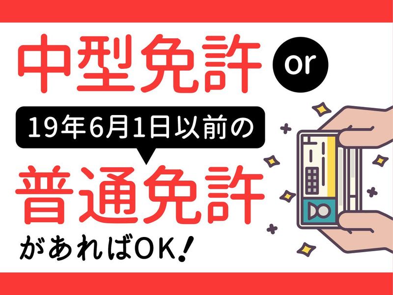 対象となる方 | 求めている人材 ・要中型免許or要大型免許 ・未経験OK ・無資格OK ・学歴不問 ・年齢不問 *20代から60代活躍中!シニア活躍中! *正社員を目指すフリーターさんなど歓迎! *元製造、元営業など異業種からの挑戦も歓迎 *久しぶりに働きたい、というブランク有の方もOK |