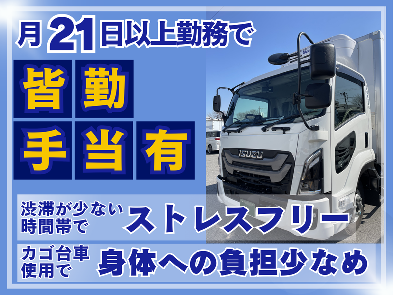 職種/仕事内容 | 仕事内容 ⏩稼働重視派にピッタリ!収入安定✨ ⏩カゴ台車使用で体への負担少なめ⭐ ⏩渋滞少なめ=ストレスなく運転に集中◎ ⏩希望休相談OK!プライベート充実! ⏩大手企業と取引多数✨仕事量安定◎ ⏩月21日以上勤務で皆勤手当あり! ⏩日中の猛暑を避けた涼しい時間帯勤務!! ――――――――――――――――――― 【4tトラックでの食品配送業務】 関東エリア内にて、食品センターから 店舗への食品配送をお願いします。 ⭐ 1日2店舗への配送です ⭐ ✅積み下ろしにはカゴ台車を使用 ┗積み替え作業は行いません◎ ✅コース設定はシステム化 ┗無理のないルートを組んでおり、 帰社予定時間を過ぎることはほぼなし! ✅配送エリア ┗埼玉県から千葉県 配送や運送未経験の方も歓迎します! 同乗研修などの研修制度はもちろん、 先輩がしっかりサポートするので 安心してドライバーデビューができます◎ もちろん経験者も大歓迎です✨ 近場・短距離、中距離、長距離など 配送距離に関わらず貨物配送や 商品配送、センター間配送などの 経験がある方も多数活躍しています! 配達やデリバリーの夜勤・単発バイトの 経験を活かす方も在籍しています。 ◤スタッフインタビューをご紹介◢  ̄ ̄ ̄ ̄ ̄ ̄ ̄ ̄ ̄ ̄ ̄ ̄ ̄ ̄ ̄ ̄ ■40代男性(夜勤配送歴8年) 「夜間帯の配送は以前から慣れていますが ここは積み替え作業がなく効率よく働けます。 今は“自分のリズム”で働けるのが 本当に助かってます。 年齢を重ねても働きやすい環境が 整っているのも魅力ですね。」 ――――――――――――――――――― ✨従業員数280名以上! 定着率が高く人手不足の心配もなし♪ ――――――――――――――――――― ここまでお読みいただき ありがとうございます! 応募はもちろん、 お問い合わせもお待ちしております。 ➿0120-597-567 (平日9時~17時) |