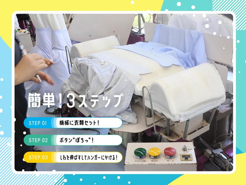 職種/仕事内容 | 仕事内容 ✅週2日~/平日のみ・土日のみOK ✅平日10~15時、土日9~17時定時 *業務量により多少前後します ✅接客なしでモクモク・コツコツ♪ ✅主婦さん&学生&フリーター活躍中 ✅扶養内勤務や、ブランクある方もOK ✅服装自由!のびのび作業できます やってみようかな…と思ったら! お気軽にお電話ください! ▼▼▼▼▼▼▼▼▼▼▼▼▼▼▼▼ 電話番号:047-492-3930 ▲▲▲▲▲▲▲▲▲▲▲▲▲▲▲▲ ⭐ 超簡単な3ステップ ――――――― [STEP1] 衣類を機械にセット! ▼ [STEP2] ボタンを"ぽちっ"と押す! ▼ [STEP3] しわを伸ばしてハンガーにかける! これで完了♪ 繰り返しのルーティンワークなので 一度覚えればサクサク進められます! ⭐ 3チームで作業分担 ――――――― ▼ Yシャツチーム Yシャツを機械に正しくセット。 左右を合わせたらシワを伸ばして、 あとはボタンを押すだけ! ▼ ドライチーム ズボン・上着・セーターなどを 専用機器にセットすればOK◎ 蒸気仕上げなので、 手間が掛かりません! ▼ 整理場チーム 仕上がった衣類のタグ番号を確認し、 店舗ごとに仕分けします。 ⭐ 先輩が丁寧にサポート ―――――― いずれの作業もシンプルです。 みんな10日ほどで、一通りを マスターしています♪ はじめは先輩がレクチャーしますし、 チームで協力して進められるので 未経験の方もご安心ください。 ⭐ 柔軟なシフト制 ――――――――― 週2日から働けて、 平日のみ、土日のみもOK! ※平日のみの場合:週3日以上 ※週2日希望の場合:土日勤務 現在はほとんどのスタッフが、 平日と土日を組み合わせて 【 週3日~4日勤務 】しています。 ⭐ シフトの提出について ―――――― 毎月末~翌月の中旬までに、 次の月の1ヶ月分のシフトを提出します。 (例)7月のシフトの場合 5月末~6月の中旬ごろに提出し、 6月末にシフトを発表! ◆ご家庭を優先にしていただきたいので、 木曜日勤務ができる方であれば、 「平日のみ」の勤務も大歓迎! ◆お子様の急な体調不良や ご家庭の急な都合にも柔軟に対応! 「代わりの人を探さないと…」という 心配も必要ありません◎ ◆「来年は子供の進学があるから、 少しでも貯金しなきゃ」などと、 Wワークをご希望の方もOKです◎ ✅ 車通勤OK(ガソリン代規定支給) |