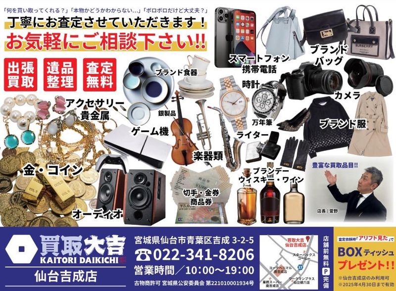 職種/仕事内容 | 仕事内容 【買取大吉 イオンタウン江刺店】の①スタッフとして接客対応②店長候補として1店舗の運営をご担当いただきます ~・~アピールポイント~・~ ・安定した固定給にプラス高いインセンティブでしっかり稼げます ・店舗内スタッフは1~2名ほどで、先輩社員が全面サポートします ・買取査定の知識はなくてもOK!営業・販売経験があるとGood! ~・~・~・~・~・~・~・~ 当社は全国1,654店舗展開中の【買取大吉】のFC運営を行っております 業界随一の買取り品目で様々な商材のお買取りをさせていただいており 『少しでも高く買取ってほしい』 『安心した店舗で売却したい』 『査定だけでもしてほしい』 など様々なお客様のご要望にお応えしており、お客様がブランド品、貴金属、ジュエリー、時計等ご売却時真っ先にご相談していただける店舗を目指します 今回募集するポジションは、店舗のマネジメントをお任せする店長候補としても ◇なにか新しいことに挑戦してみたい! ◆営業・販売の経験を活かして働きたい! ◇インセンティブ制度でしっかり稼ぎたい! ◆1店舗の運営やマネジメントをしてみたい! そんな気持ちを持った仲間を求めています! 社員全員でバックアップするのでご安心ください! 当社は宮城県内だけでなく6月には岩手北上店オープン!そしてそのあとも東北エリアでの事業展開を計画しておりますので、一緒にワクワクな気持ちも楽しんでいける方からのご応募お待ちしております <具体的には> 〇入社後『買取大吉』についてや査定業務に関する知識研修を受講していただきます ●こちらの講習は約10日間ほどで終了する研修になります 〇その後は買取接客や店舗運営のノウハウを店舗実務の中で学んでいきましょう! <主な業務内容> ◆売却(処分)希望で来店された方の接客対応(1日3~5件程度) ◇お客様はコレクターさんや不用品を売却したい一般の方がメイン ◆お品物の査定業務(AI査定・FC本部のバックアップあり) <収入アップも可能> ☆店舗の買取実績に応じてインセンティブは毎月支給なので、月給にプラスして収入アップすることが可能 ★日々の業務に対する姿勢や実績を評価するので「稼ぎたい」とお考えの方にピッタリ ☆買取業務未経験の方でも充実の研修でスピーディーに学ぶことが可能 <1日の流れ(一例)> 10:00 出勤 10:00~11:00 接客・店舗運営 11:00~12:00 接客・査定 12:00~13:00 お昼休憩 13:00~17:00 接客・査定 17:00~19:00 接客・店舗運営 19:00 退勤 |