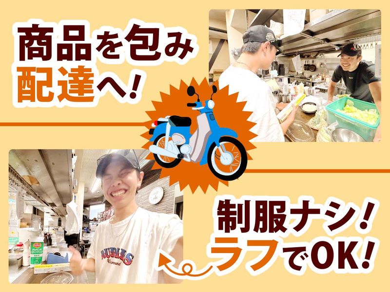 職場環境・雰囲気 | 職場環境 オープニングなので皆一緒のスタート! デリバリーや調理が未経験の方や、 初バイトという学生さんも大歓迎です。 どうせバイトをするなら 立ち上げメンバーとして働きませんか? ご応募お待ちしています! |