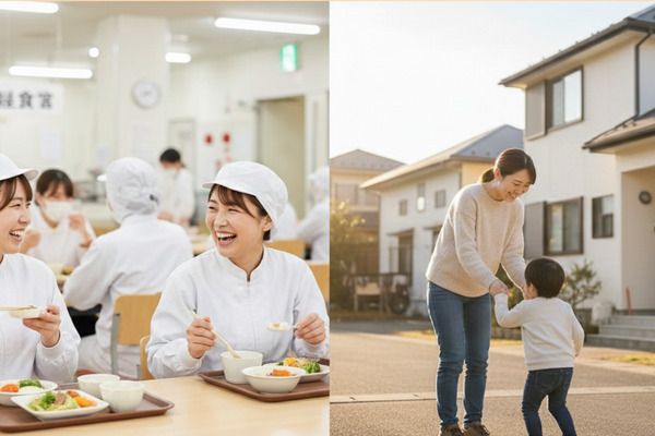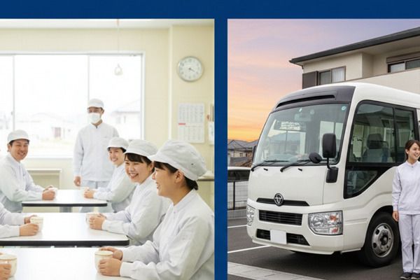 待遇・福利厚生 | 【保険制度】 雇用保険、労災保険、健康保険、厚生年金 【福利厚生】 待遇 ❖社会保険完備 ❖交通費支給(規定) ❖制服貸与 ❖無料送迎あり(自宅前や近くのコンビニなど) ❖退職金制度あり ❖住み込み寮(社宅)あり※空き状況による ❖社員食堂あり ❖工場見学OK |