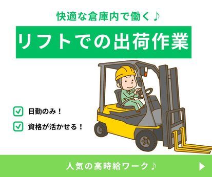 職種/仕事内容 | 仕事内容 快適倉庫での仕分け・ピッキング・箱詰め・シール作成など 常温倉庫・冷蔵倉庫でご勤務できます ★売店・カフェテリアあり <こんな方の応募が多数です> (1)「次のお仕事が決まるまでのつなぎに◎ 即日勤務OK!すぐに働けます」 (2) 「ブランク期間をつくらず収入確保!転職活動と両立できるお仕事」 (3) 「スグ働ける!日払い・週払いOK◎ 転職準備中の収入も安心」 「転職活動中も収入をキープ!スキマ時間で働ける柔軟シフト◎」 「正社員へのステップにも◎ 経験不問&即日スタートで新しい一歩を!」 他にも主婦(夫)・パートさんも活躍しています 【いつでもどこでも登録OK★】 ◆登録時【履歴書不要】【来社不要】 ◆当社HPから、365日/24hいつでもWEB登録可能♪ <Q&A>入社までの流れについて Q. 応募してからどれくらいで働けますか? A. 応募から入社までは、1週間~通常2週間以内の現場が多くなっています。 Q. 急いで仕事を始めたいのですが対応してもらえますか? A. 即日面談やスピード対応が可能な案件もご案内可能! ご希望をお伺いして、最短で就業できるお仕事をご紹介いたします。 Q. 他の仕事と比較してから決めたいのですが、相談だけでも可能ですか? A. もちろん可能です。 複数の選択肢をご提示しながらご案内します! <Q&A>収入について 【お給料の支払いについて】 Q. 日払いは対応していますか? A. はい、日払いに対応しています。 前日の11時までに申請⇒当日の夕方までにお給料をお受け取りいただけます。 Q. 夜勤の場合でも日払いは可能ですか? A. はい、夜勤後も対応可能です。 お仕事終了後、朝11時までに申請⇒その日のうちにお給料をお受け取りいただけます。 Q. 前払い制度はありますか? A. ご利用可能です。 詳細は勤務先や就業形態によって異なりますので、ご相談時にご希望をお伝えください。 Q. 申請方法は難しいですか? A.どなたでもスムーズにご利用いただけます。 スマートフォンやPCからの申請も可能です! |