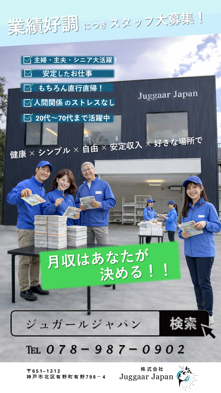 勤務地 | 株式会社Juggaar Japan 本社 651-1312兵庫県神戸市北区有野町有野798-4 |