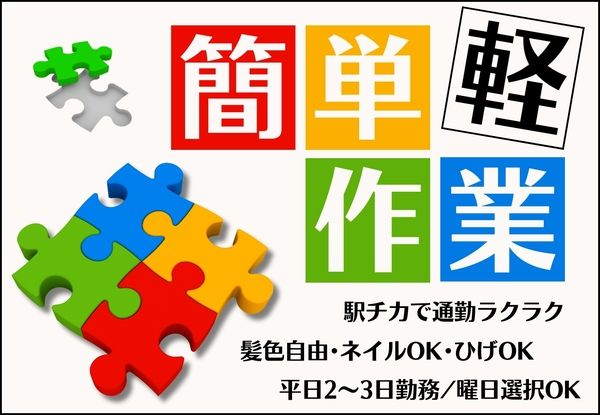職種/仕事内容 | 仕事内容 電化製品の検品や梱包、部品の取り付け作業など♪ 冷暖房完備で快適です(^_-) 何れかの部署に配属 カンタン単純軽作業 10代、20代、30代、40代スタッフ活躍中 ====================== 駅チカで通勤ラクラク☆冷暖房完備で快適環境!髪色自由・ネイルOK・ひげOKでオシャレも楽しめます♪ ====================== 扶養内OK!社会保険なしで働けます♪駅チカで通勤ラクラク☆冷暖房完備で快適環境! |
