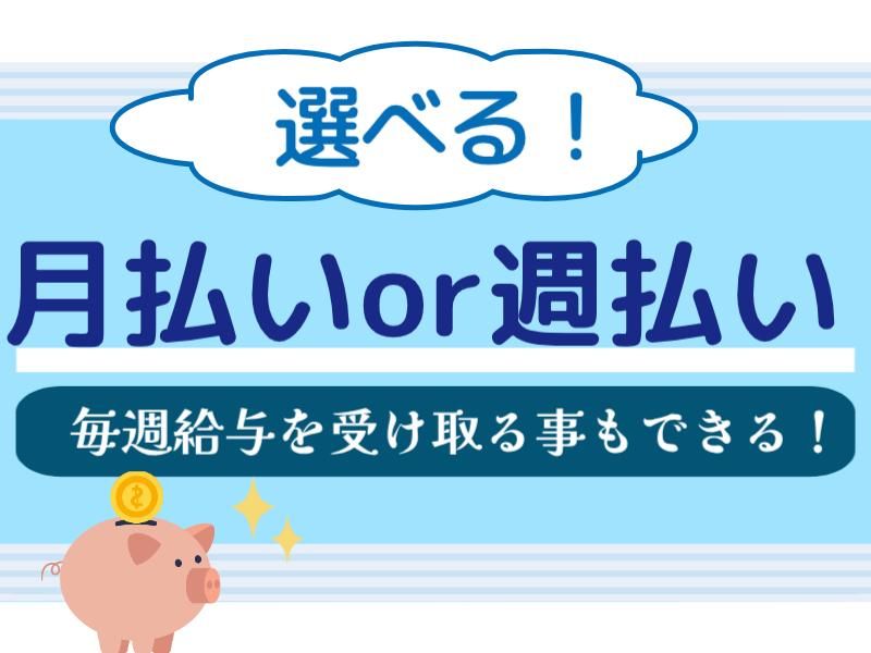 待遇・福利厚生 | 【保険制度】 雇用保険、労災保険、健康保険、厚生年金 【福利厚生】 待遇・福利厚生 【福利厚生】 *社会保険完備 *交通費規定支給 *有給休暇 *車・バイク・自転車通勤OK *職場見学OK *駐車場完備 *休憩室あり *制服貸与 *鍵付きロッカーあり *自動販売機あり ■給与は「月払い」「週払い」選択OK! 〜週払いの場合〜 1週間の実稼働分から社保月額1/4を引いた額を支給 |