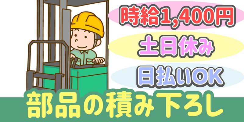 職種/仕事内容 | 仕事内容 フォークリフトを使用して自動車部品の積み下ろし・入庫出荷・ピッキングなどのオシゴト フォーク作業のほかにも倉庫内で手作業も行います 「フォークリフトの経験が浅くて不安…」というでも練習期間があるので心配ナシ!資格を活かして働けます 出張面接いたします!就業前の職場見学OK! まずは、ご応募から!お待ちしております! 20歳~50代後半の男女活躍中! ・就業場所は、東新町中央公園 近郊 オススメpoint ・うれしい土日休み ・小休憩あり こまめに休憩できる環境です ・ロッカー完備 ・駐車場あり らくらくマイカー通勤 ・フォークリフト免許をお持ちの方 ・土日休みご希望の方 ・長期のお仕事お探しの方 ・高時給のお仕事お探しの方 ・資格を活かして活躍したい方 ・1月あたり平均残業時間20h 【こんな経験活かせます!】 パート、アルバイト、契約社員 雇用形態問わず、下記の経験ある方は活かせます! ・倉庫内(構内)作業 ・工場作業 ・フォークリフト作業(カウンターフォーク/リーチフォーク) ・積み下ろし ・入庫 ・ピッキング ・出荷準備 ※もちろん必須ではありません! まずはお気軽にご応募ください ///////////////////////////////////////// (WEBでご応募の場合) お電話番号を記入していただくと ご案内がスムーズです。 ///////////////////////////////////////// |