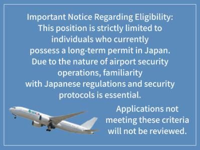 対象となる方 | 求めている人材 ✅日本国内在住の方 ✅日本国内での長期的な 就業資格を現段階で有する方 Individuals who currently hold a long-term work permit in Japan. ――― ⋆⋅☆⋅⋆ ――― ⋆⋅☆⋅⋆ ――― *This job requires at least N1 level Japanese proficiency.* ――― ⋆⋅☆⋅⋆ ――― ⋆⋅☆⋅⋆ ――― *未経験者も大歓迎! *男女ともに歓迎! *接客が好きな方も歓迎します! ≪こんな方にピッタリ!≫ ◇平日に休みを取りたい ◇ノルマが無い仕事がしたい ◇転居を伴う転勤をしたくない ◇社会貢献度の高い仕事がしたい ◇適度に体を動かして働きたい ◎資格保持者優遇!! ┗航空保安検定1級・2級 をお持ちの方 ✨✨✨✨✨✨✨✨✨✨✨✨ 前職、さまざまな業界から 転職してきたメンバーが頑張ってます♪ YouTuber、漁師、バレエ教師、 ショップ店員、現場監督、プロレスラー、 サービス業、接客業、ショップ店員などの 販売業、看護師、介護福祉士など。 みんなそれぞれの想いを胸に 転職を果たしています。 ✨✨✨✨✨✨✨✨✨✨✨✨ ✅20代・30代が活躍 ✅異業界からの転職者がほとんど ✅人と接することが好きな方にピッタリ ✅Iターン・Uターン歓迎 ✅上場企業のグループ会社 ✅産休、育休から復帰したメンバー多数 ✋採用時に身元確認者が必要になります! |