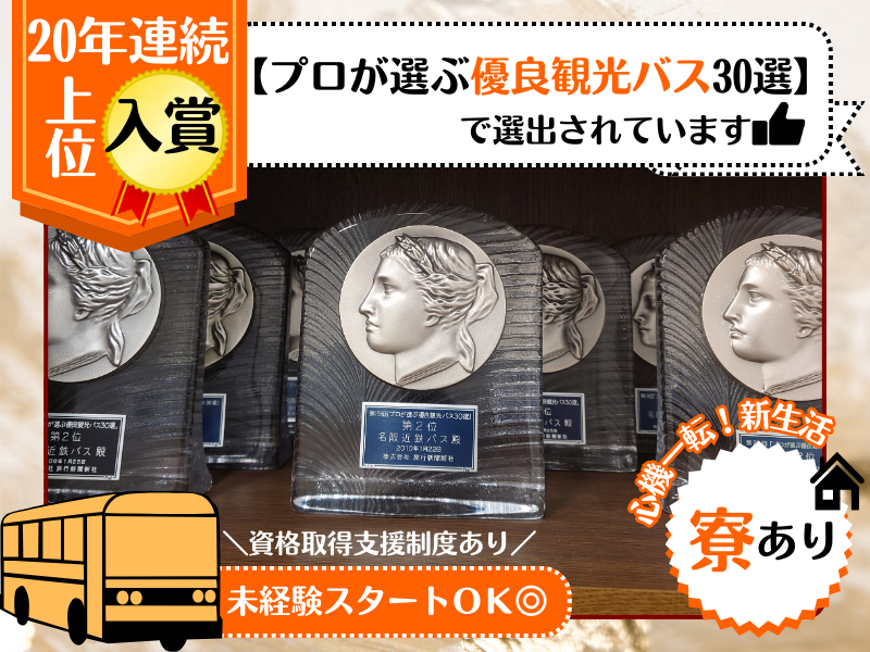 職種/仕事内容 | 概要・業務内容 ✅この求人のポイント ・大手近鉄グループ参加の安定企業 ・20~50代までの幅広い男女スタッフが活躍中! ・入社祝い金最大30万円支給✨※規定あり ・福利厚生充実!年2回の賞与や家族手当など…嬉しいが沢山♪ ・安心安定企業!優良観光バス30選で2026年1位! ・ブランクのある方や以前弊社で勤務されていた方も大歓迎。 修学旅行や社員旅行、遠足などの貸切バス・ツアーバスなどを運転する観光バスドライバーのお仕事になります。 事前に立てられたスケジュールに沿って、目的地までお客様を安全にお連れしていただきます。 多くの場合は日帰りだと東海三県のほか東は静岡、山梨など、西は京都や大阪などに行くことが多いです。宿泊のある旅行の場合だと関東から四国はもちろん、時には東北地方や九州まで行くこともあり、幅広く運行します。 ドライバー業務はもちろん、運転以外でもコミュニケーションを通して、乗車いただいたお客様に素敵な旅の思い出を作っていただくお仕事になります。 ツアー後には「思い出に残る1日になりました!」と感謝の言葉を寄せられることもありやりがいのあるお仕事です。 ●ご興味がある方はフリーダイヤルまでお問い合わせください。 お電話の際は、求人番号「3の1」とお伝えください。 名阪近鉄バス採用センター:0120-645-028(営業時間:平日9:00~18:00) |