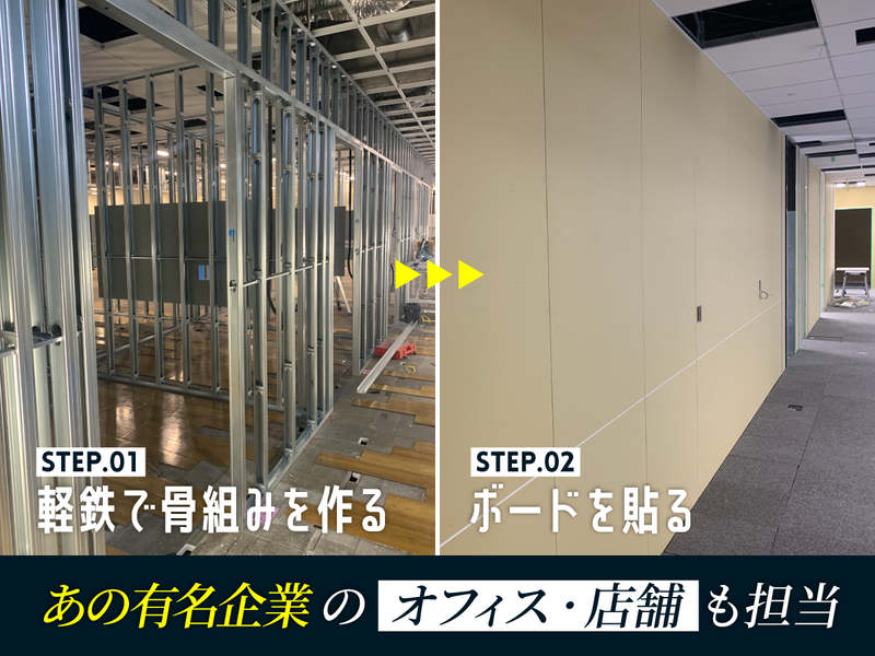 職種/仕事内容 | 仕事内容 創業30年!世界的なイベントや 有名ブランド店舗・超高級エリアの 大規模複合施設なども担当する 軽鉄工事・ボード工事特化の専門企業! ◆残業なし ◆年収600~800万円も可 ◆営業経験ゼロから オフィスワークデビュー可! (職人経験尚歓迎) ◆高卒OK! ============= 現場の知識が一通り 身についた2年後を目安に、 営業職にステップアップ可能! ============= 本人の希望に応じて 長年取引があるお客様を回る 完全ルート営業をお任せします。 お客さんのところへ伺うと 当社に頼みたい仕事が決まっているので 案件の内容をヒアリング。 会社に戻ったら 現場監督と打ち合わせて、 スケジュールを決めて 見積もり書を作って 材料や職人を手配します。 電話がけ・飛込み・新規開拓、 ノルマなどは一切なく、 “営業をかける”ことも ほとんどありません。 「オフィスワークやってみたいけど 経験も学歴もないし、 いきなりはハードルが高くて…」 「ずっと現場仕事は心配で…」 という方はぜひご応募ください! マナーなどはイチから教えますし、 お客さんは顔なじみばかりなのでご安心を! 軽鉄工事の安定企業で 世界的な案件を担当する 営業職を目指してみませんか? ============== 具体的なお仕事内容は… ============== 商業施設やオフィスビルの 内装仕上げ工をお任せします。 かんたんに説明すると、 軽量鉄骨(軽鉄)で 天井や壁の骨組みを作って、 そこに石膏ボードを貼ったら完成! 現時点ではピンと来てなくても大丈夫! 研修でしっかりと教えていきます。 ▼具体的には… ・天井や壁の下地工事 ・ボード貼り ・軽鉄工事 …など ※軽量鉄骨(4メートル・5kg程度)の運搬 など力を使う仕事もあります。 【1日の流れ】 8:00 出勤・朝礼 8:30 作業開始 12:00 昼休憩 13:00 作業再開 17:30 退勤 ※間に小休憩あり 【主な現場エリア】 東京23区内を中心に関東近郊エリア ============== 現場のアシスタントから! ============== まずは先輩について 各現場でのアシスタント業務。 道具の買い出し、車の運転、 倉庫の整理整頓、 ボードを手で押さえておく 材料を運んでくる…といった できることからスタート。 実際に道具に触れながら 学んでいけます! 慣れてきたら、 足場の組立やボード貼りなど 実際の施工もお任せします。 早くて1年程度で一人前、 2~3年目には後輩の 指導ができるようになっています! 成長は昇給・賞与などで しっかりと還元します。 ============== 年商11億円突破の安定企業 ============== 1996年の創業以来、都内近郊の 商業施設やオフィスビルの 内装仕上げ工事に携わってきた当社。 リニューアル工事から店舗内装、 大型現場など案件は幅広く、 20社ほど継続的な取引があり 安定した仕事量があります! 2018年に内装用仮設資材レンタル事業を 開始し、2022年にはその事業を分社。 事業の拡大を続けています。 今後も売上の増加を目指すとともに 従業員の収入や休みも増やし、 体力的な負担の軽減も実現したいと 考えています。 |