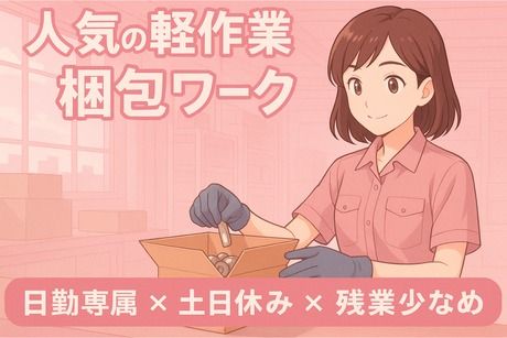職種/仕事内容 | 仕事内容 \業績好調につき、新規メンバー募集!/ 【POINT】 ・どなたでも始められる軽作業 ・土日祝休み+長期休暇(GW/夏季/年末年始)あり ・有給休暇も取りやすくてプラベ充実♪ ・入社時期の相談OK☆ コツコツ進めるのが得意な方にぴったり♪ 清潔&快適な空間で気持ちよく働けます◎ 夏は涼しく、冬はあたたかい空調完備の職場です。 年中同じ環境で、無理なく続けられます。 【お仕事内容】 ボディ用ウェットシートなどの身近な製品を 決まった流れで箱に詰めていくお仕事です。 扱うのは手のひらサイズのウェットシート! 力作業はなく、リズムよく進められます♪ ●衛生製品を扱うのでいつでも清潔 ●落ち着いた雰囲気で、集中しやすい環境 ●20、30代、40代の女性スタッフメインに活躍中! 【安心のサポート体制】 ・担当スタッフが職場とのやり取りをしっかりサポート ・ドキドキの入社初日は担当が同行するので安心! ・現場には頼れる班長もいて安心 ・電話やLINEでいつでも相談できます◎ 当社は《無期雇用派遣》をおこなっています。 契約期間を気にせず、長く働くことが可能です♪ 【スタッフの声/20代女性】 シンプルな作業ばかりで思ったより始めやすかったです。 分からないことは先輩がすぐフォローしてくれるので、不安なく続けられています。 土日祝休みのおかげで、仕事とプライベートの両方を大切にできています。 【スタッフの声/30代女性】 前職はシフト制で忙しく、土日祝休みの職場を求めて転職。 未経験でも、黙々作業が自分に合っていて安心して働けています。 班長や管理担当の方が相談に乗ってくれるので心強いです。 【スタッフの声/40代女性】 子どもが手を離れたのをきっかけにフルタイム復帰。 最初は立ち仕事に慣れませんでしたが、すぐペースが掴めました。 日によって作業が変わるので飽きずに続けられています。 【応募もカンタン】 ・面接1回のみ/服装自由でOK ・電話面接OK(スマホ1つで完結!) ・履歴書なしでもOK(入社決定後の提出でOK) 人柄重視の採用です。 2026は午年! 午年は物事がスピーディに動き出し、挑戦が実りやすいと言われる年だそう。 まさに今は、新しい一歩を踏み出すのにピッタリのタイミング! 人数が集まり次第募集を締め切りますので、ご応募はお早めに! ※応募はたったの60秒で完了します♪ 「気になるかも…」と思ったら、まずはお話だけでもOK♪ ┏━━━━━━━━━━━━━━━━━━┓ 年末年始のご連絡について ┗━━━━━━━━━━━━━━━━━━┛ 12/27~1/4は年末年始休業のため、 期間中にご応募いただいた方へのご連絡は 【1/5以降、順次】行います。 「応募したけど連絡が来ない…」と ご心配なさらず、安心してご応募ください♪ 業務の変更範囲:「会社の定める業務」 |