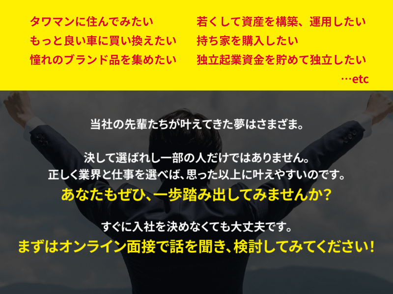 給与 | 月給300,000円以上 給与詳細 基本給:月給 30万円 〜 固定残業代:なし 【一律手当】 全員に一律で支払われる通勤・皆勤・家族手当金額:なし 全員に一律で支払われるその他手当金額:なし 成約実績に応じて毎月インセンティブ支給 残業代は別途全額支給(月20時間いかない程度です) ★入社後3ヶ月間は月収55万円保証 (月給30万円+特別手当25万円) 【給与例】 給与例 成約率80%を誇り、未経験者でも成果が出やすい仕事のため、入社1ヶ月目で月収200万円も珍しくはありません。 ・初年度想定年収900万~1500万円 ・在籍スタッフ20名中19名が月収100万超え ・平均年収1500万円 ・最高月収800万円 これだけの高収入だと… 「相当な根性が必要なのでは?」 「残れるのは一部の人だけでは?」 「激務なのでは?」 「長くは働けなさそう…」 と不安になるかもしれませんが、心配ありません! ★成長市場&仕組み整備 今まさにニーズが伸びているリユース業界(中古品の査定・買取事業)。 お客様からの需要が多いため、自然と収入が得やすいのです。 業績が伸びているとはいえ、忙しすぎては人が疲弊し、退職し、結局どこかで伸び悩みます。 そこで当社では、多くの従業員が無理なく効率良く高収入を得られるよう、あらゆる仕組みを整えました。 ★完全反響による圧倒的効率 テレビ・Webに加え、代表自らが堀江貴文氏のラジオ局でレギュラー出演。 「安心と信頼」を全国に発信し、問い合わせ件数はうなぎのぼり。 売り込み不要、完全反響対応のみで高い成約率を実現しています。 |