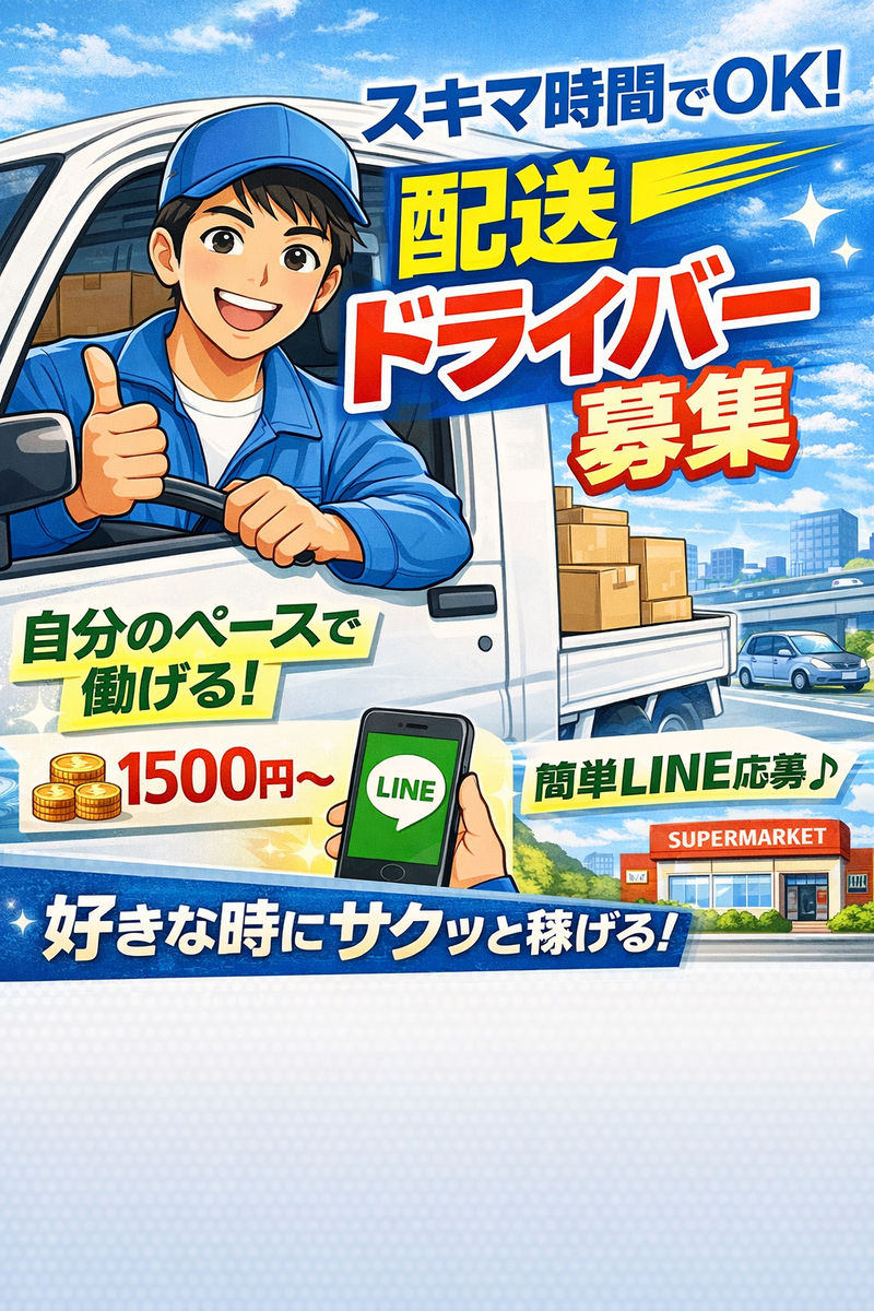 職種/仕事内容 | 仕事内容: スキマ時間の有効活用な業務委託 ■ 職種 催事商品の納品・補充ドライバー(業務委託) ⸻ ■ 業務内容 ・スーパー・商業施設への商品納品 ・売場への補充作業 ※主な業務は「依頼場所への納品」です ※シンプル作業(重労働なし) ⸻ ■ 勤務形態 ・業務委託契約 ・案件ごとの依頼制 ・ご希望・対応可能な案件に応じて依頼 ⸻ ■ 勤務時間 ・案件ごとに異なる(目安:1〜4時間程度) 時間帯例: ・5:00〜10:00 ・8:00〜15:00 ・14:00〜21:00 ・18:00〜22:00 ※納品先の営業時間内であれば対応可能な時間でOK ※スキマ時間で働けます ⸻ ■ 勤務エリア 一都三県(東京・神奈川・千葉・埼玉) ※対応可能エリアのみでOK ⸻ ■ 報酬 ・時給 ベース1,500円 ・1現場あたり最低2時間保証 ⸻ ■ 交通費 ・ガソリン代:走行距離に応じて支給 ・駐車場代:指定がない場合は実費支給 ・高速代:ルートに応じて事前相談 ⸻ ■ 応募条件 ・自家用車で対応できる方 ・運転免許必須 ・単発案件に柔軟に対応できる方 ⸻ ■ 応募方法 ・LINE登録後、案件情報を随時配信 ・対応可能な案件を選択していただきます ・詳細条件(距離単価など)はオンライン面談でご説明 ⸻ ■ ポイント ・好きなタイミングで働ける ・短時間OK ・スキマ時間活用 ・固定シフトなし ⸻ ラインアカウントのご登録で 配送案件やスポットの お仕事をお届けします。 登録だけでもぜひ お待ちしてます。 面談はオンラインです。 |