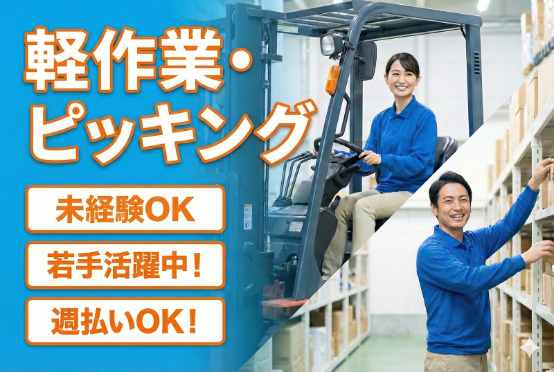 職種/仕事内容 | 仕事内容: 雑貨のピッキングをお願いします(^^)/ 【1日のスケジュール】 就業時間 8:45〜17:45(12:00〜13:00 昼休憩) 午前中は運送会社の受入れ及び 倉庫への搬入がメイン! その他、注文書を見て 商品をピッキング→梱包(荷造)→ 運送会社への発送準備という、 とてもシンプルな流れです! 在庫管理(月一回の棚卸含む) ——ココに注目!!—— 夏の暑い日も安心♪空調が整った倉庫が勤務地です♪ <高収入!> ■給与 時給1500円〜(通常時給)+交通費支給(規定有) ■週払い ■土日祝休み ※稀に勤務の場合がございます ■未経験・初心者歓迎 ■フリーター歓迎 ■社会保険制度あり |