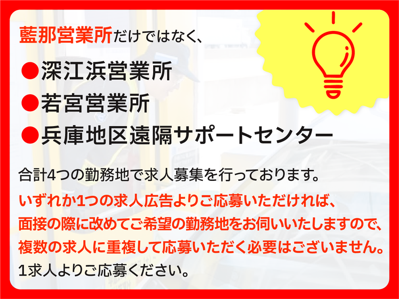 勤務地 | 藍那営業所(阪神高速トール神戸株式会社) 651-1104兵庫県神戸市北区山田町藍那48 |