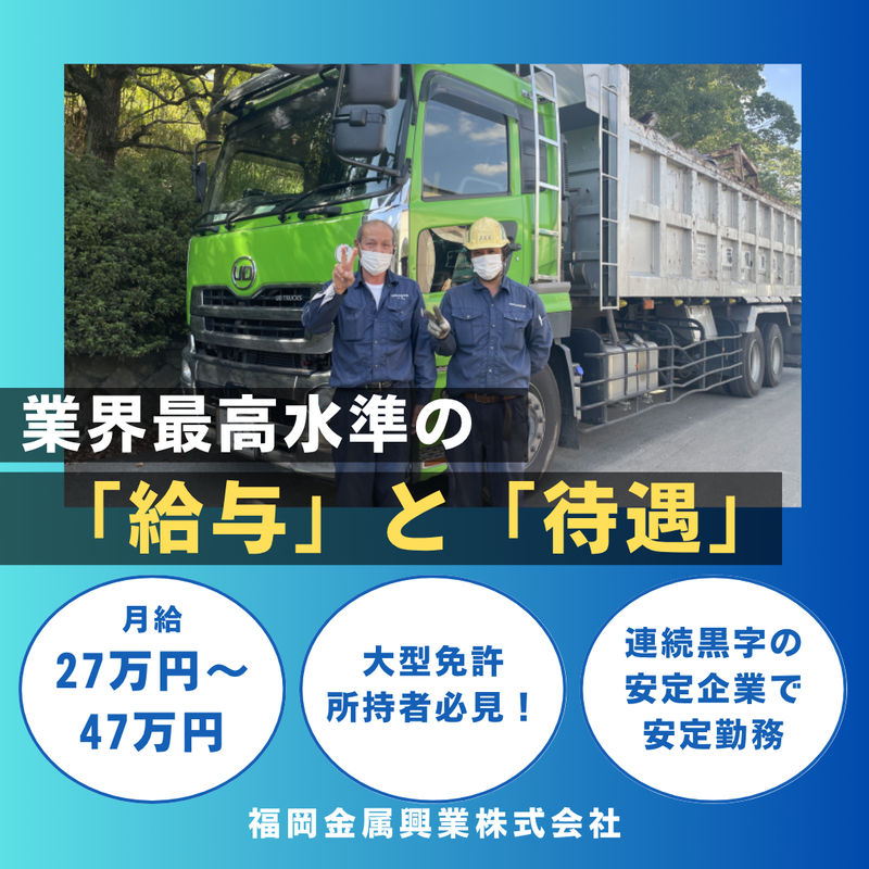 職種/仕事内容 | 仕事内容 ⭐――――――――――――――⭐ \大型免許を活かして高収入!/ 創業75年★連続黒字の安定企業で ✨月収47万円以上も可能✨ ⭐――――――――――――――⭐ 金属スクラップの入出荷に伴う運送業務をお任せします。 運転するのは10tダンプで、大型免許があればOK! 地場中心で基本は日帰り運行なので、無理なく安定して働ける環境です◎ <具体的な業務内容> ● 本社工場を中心に九州一円エリアでの入出荷輸送 ● 金属スクラップの運搬(積み込みは重機中心) ● 行き先ごとの運行・構内ルールに沿った安全対応 ※月2回ほど夜勤あり(深夜手当でさらに収入UP) 最初は先輩が同行し、運行ルートや構内ルールまで丁寧に教えます◎ ✨POINT✨ ◇創業75年!連続黒字の安定企業 ◇地場中心&日帰り運行が基本 ◇手当・福利厚生が充実 ◇ブランクありの方も大歓迎 ◇大型免許があれば実務未経験でもOK ◇生活リズムを崩さず働きたい方におすすめ ◇ミドルシニア応援 ✨先輩スタッフの声✨ 「ドライバー経験はありましたが、前職より安定して稼げるのが魅力でした。 現場の安全管理も徹底しているので安心して働けています。 会社全体に“人を大切にする”雰囲気があって、長く続けやすい職場です!」 ✨こんな方にぴったり✨ ✅大型免許を活かして長く働きたい ✅今より収入アップしたい ✅地場中心で無理なく稼ぎたい ✅運転の仕事で安定した収入がほしい ✅安定した会社でキャリアを築きたい ⭐資格を活かして、無理なく安定収入⭐ まずはお気軽にご応募ください✨ |