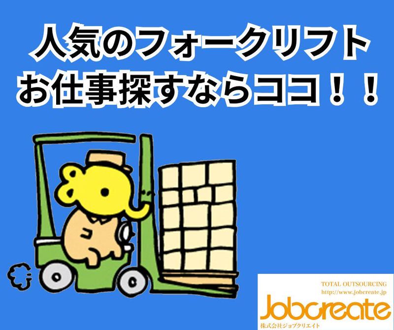 職種/仕事内容 | 仕事内容 No.62442 当社オープニング! 京都綾部市エリアから フォークリフト作業 スタッフさん募集です☆ \嬉しいメリットいっぱい!/ ・交通費原則全額支給 ・各種社会保険完備 (雇用・労災・健康・厚生年金) ・有給休暇付与(6ヶ月継続勤務) ・週払いOK(規定有り) ※土日祝日に頂いたご応募に関しましては、 翌営業日に順次対応させていただきます。 ■リフトでの運搬梱包作業 土日休み■ 大手有名企業にて 当社オープニング スタッフの募集となります☆ << お仕事内容 >> フォークリフトを使用して 製品の移動や コンテナへの積込みや荷下ろし作業 また手作業でのピッキング作業もお願いします 残業は希望者のみで あったとしても 1時間/日、20時間/月程度です。 大手企業のグループ会社様なので 残業時間もきちんと管理されており また土日休みやマイカー通勤OKなど 安心してご勤務していただけます。 【勤務地】 京都府綾部市とよさか町 【時 間】 8:30~17:00 (実働7.45時間※残業20時間/月) 【休 日】 土曜・日曜・長期(お盆・年末年始) 【最寄駅】 JR「淵垣駅」から車で5分 JR綾部駅 福知山市・舞鶴市からも通勤されております。 ◆車・バイク・自転車通勤OK ◆土日お休み・長期休暇あり ◆最寄りのコンビニまで5分 ◆倉庫会社でのフォークリフト作業経験 **-** ジョブクリエイトは 大阪府高槻市にある派遣会社です。 製造、倉庫内、梱包などの軽作業はもちろん オフィスワークや販売促進など 豊富な人材サポートを行っております! 阪急高槻市駅から歩いて3分♪ 来社不要のWEB面談も実施しております! ご希望の方はお気軽にお申し付けください☆ **-** <自宅から面接ができるWEB面接実施中> 来社不要のスマホ面接もございます! ご自身のPCやスマホで ご自宅からかんたんに面接♪ <apアプリポイントプレゼント!> 日々のお仕事でポイントがたまり、 日用品や家電、食品、旅行券などの 商品と交換していただけます! ※土日祝日に頂いたご応募に関しましては、 翌営業日に順次対応させていただきます。 **-** |