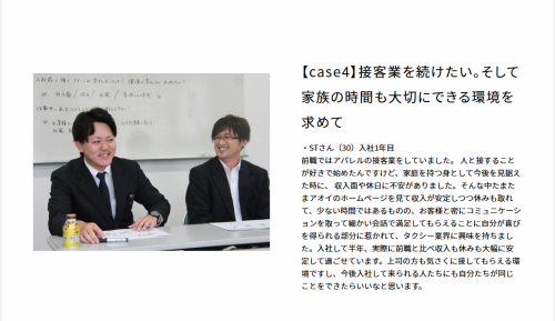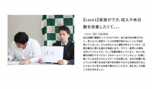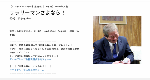 職種/仕事内容 | 仕事内容 ――――――――――――――――――― 私たちが大切にしている「働く人の幸せ」 ――――――――――――――――――― 地元京都で愛され続けるタクシー会社として、ドライバーの「働きやすさ」を何よりも大切にしてきた当社。 「もっと家族との時間を大切にしたい」「安定した収入で、将来の不安をなくしたい」「第二の人生で、新しい挑戦をしたい」 異業種からの転職や年齢への不安、家族の反対など様々な壁を乗り越えてタクシードライバーという仕事を選択した人たちの想いをお届けします。 【アオイグループの採用サイトでは、新人からベテランまで約30名の乗務員インタビューを掲載中!】 https://recruit-aoi-group.com/interviews <今回想いを語って頂く方のストーリー> 【Case1】30代・介護職から転職 家族との時間を大切にできる接客業に出会って 【Case2】30代・アパレル接客業から転職 天職だと思っていた接客業、でも収入や休日面の不安が... 【Case3】50代・大学職員から転職 50代で決断したセカンドキャリア 【Case4】60代・管理職から転職 サラリーマン生活に終止符、元管理職のセカンドキャリア ー ―――――――――――――――――――― 前職のサービス業から安定収入と家族時間の充実を求めて ―――――――――――――――――――― 【家族との時間を大切にできる接客業に出会って】(30代・入社1年目) 前職は介護職。やりがいはありましたが、収入面や休日数が少なく、思うように家族サービスの時間が取れないことに不満を抱いていました。 -転職の決め手は意外な出会い- 転職活動をしている頃、なんと前職の同僚がアオイグループのホームページのインタビュー記事に載っているのをたまたま見つけたんです! その記事を読むと、自分が抱いていた不満である収入面や休日数を今よりも改善できるんじゃないかと思える内容でした。 ▼意を決して入社した先に待っていた変化とは、、、 続きはインタビューページで! https://recruit-aoi-group.com/interviews/3148 ー 【転職だと思っていた接客業。でも収入や休日面の不安が…】(30代・入社1年目) 人と接することが好きで始めたアパレル業界。接客の仕事は天職だと思っていました。 でも、家庭を持つ身として将来を考えた時、収入や休日面に不安もあったんです。 -接客の仕事は天職だと思っていた彼 なぜタクシー業界へ?- 転職も考えている頃、たまたまアオイのホームページを見て驚きました。 収入が安定しつつ休みも取れて、さらにお客様と密にコミュニケーションが取れる。 前職では長時間の接客でしたが、タクシーは短い時間でも細かい会話でお客様に満足してもらえる。 その瞬間に自分が喜びを得られることに惹かれて入社しました。 ▼入社して半年、収入も休みも大幅に安定した現在、、、 続きはインタビューページで! https://recruit-aoi-group.com/interviews/3148 ー ―――――――――――――――――――― 人生の転換期に選んだタクシードライバーという新たな道 ―――――――――――――――――――― 【50代で決断したセカンドキャリア】(50代・入社1年目) 大学職員を勤めて32年、管理職なども一通り経験して50代中盤に差し掛かかった中、今の仕事は若い人に任せて第二の人生でやってみたかった仕事に就こう!そんなことを思っていました。 アオイを選んだのは、お客として乗車した時の体験がきっかけ。 親切な応対に感動し、その時のレシートは今でも大切に保管しています(笑) -アオイのタクシーは観光だけじゃない お客様との親近感が魅力- 正直、京都だから観光客ばかりかと思っていました。 でも実際は地元の常連さんとの何気ない会話が本当に楽しいんです。 『今日は寒いね』『桜が咲き始めたよ』そんな日常の会話から、お客様の人生相談まで。 前職では考えられなかった距離感です。 ▼乗務員同士仲が良い!働きやすい環境もアオイの魅力、、、 続きはインタビューページで! https://recruit-aoi-group.com/interviews/2420 ー 【ラリーマン生活に終止符、元管理職から見つけた人生の転機】(60代・入社12年目) サラリーマンとして歩んできた約27年間。 頑張れば頑張るほど、プレッシャーや人間関係での悩み、将来への不安から、毎晩大量のお酒を飲まずには自分を保てませんでした。 そんな時、新聞広告の「タクシードライバー募集」が目に留まり、応募してみました。 -心に残る「ありがとう」の瞬間- ある朝、小さな赤ちゃんを連れたご夫婦が私のタクシーにご乗車され、いつも通り『赤ちゃんを抱っこされる方が私の後ろにどうぞ』とお声がけをし、目的地までお送りしました。 その日の乗務を終え事務所に戻ると、なんとそのご夫婦から『本当に丁寧なお声がけをいただき嬉しかったです』とお電話があったとのこと。 小さな『ありがとう』がこんなにも自分の心に安らぎを与えてくれるんだな!と実感できる瞬間があるのも、タクシードライバーの醍醐味だと思っています! ▼ドライバーをするうえ