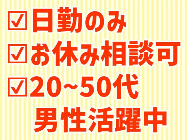 日勤固定/未経験OK/お休み相談可/残業少なめ/休憩3回/喫煙所あり/20代~50代男性活躍中