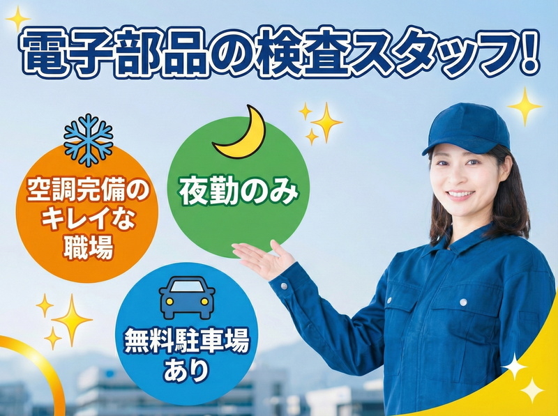 職種/仕事内容 | 仕事内容 ✅30代・40代女性が活躍中! ✅未経験OK!80%の方が未経験スタート ✅空調完備のキレイな職場です! ✅土日祝休み&年間休日120日以上♪ ✅無料駐車場完備!マイカー通勤OK♪ ✅人見知りでも大丈夫!コツコツ黙々作業! 【仕事内容】 上尾市にあるキレイな工場で、 スマホなどに使われる小さな電子部品の 検査などをお任せします。 効率よく稼げる「夜勤専属」のお仕事! コツコツ・モクモクタイプの方に最適です◎ ~具体的には~ 軽量の電子材料を目視で検査します。 丁寧に指導いたしますので、ご安心ください◎ 重量物を持つことはありません。 空調完備の快適な職場で、 季節を問わず働きやすい環境です。 \人見知りでも安心のコツコツ作業✨/ 「人と話すことが苦手、、」「集中してコツコツ働きたい」など 人見知りの方でも活躍できる環境です! 現在、30代・40代の女性が中心に活躍中! \趣味も生活も、もっと豊かに✨/ 趣味や推し活、楽しんでいますか(*´ω`*) 夜勤専属の方は、時給1750円! 月収26万円以上が可能! 好きなことにもっとお金を使えちゃいます♪ 給与前払い(週払い)もOKなので、 急な出費やイベントがあっても安心です! \ストレスフリーな通勤と職場✨/ マイカー通勤に嬉しい無料駐車場完備! 上尾駅から車で10分とアクセスも◎ 通勤はいつもの私服でOK! お仕事用の制服は無料で貸与します! 個人ロッカーもあり、仕事とプライベートの 切り替えもスムーズです♪ |