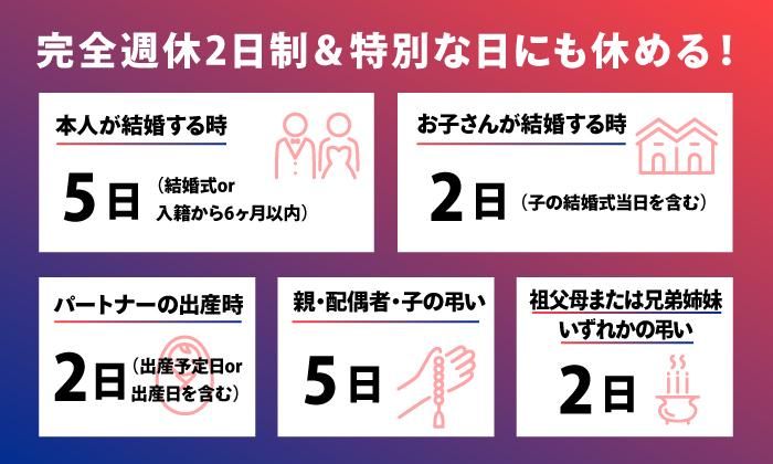 休日休暇 | 休日休暇 完全週休2日制 ※勤務先により土日祝休み有 【休暇制度】 ・GW休暇 ・夏季休暇 ・年末年始休暇 ・慶弔休暇 ・育児休暇 ・介護休暇 ・リフレッシュ休暇 【特別休暇】 ・本人が結婚する時/5日(結婚式or入籍から6ヶ月以内) ・お子さんが結婚する時/2日(子の結婚式当日を含む) ・パートナーの出産時/2日(出産予定日or出産日を含む) ・親、配偶者、子の弔い/5日 ・祖父母又は兄弟姉妹の弔い/2日 |