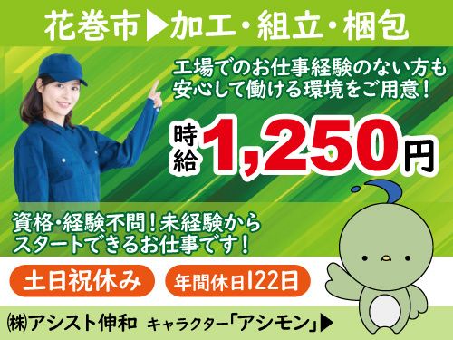 職種/仕事内容 | 仕事内容 岩手県花巻市にある工場にて勤務いただく、 加工・組立スタッフを募集します! 製造未経験者も多数活躍中! 「オススメポイント」 ・未経験からスタートもOK! ・日勤帯で無理なくお仕事できる! ・土日祝休みでしっかり休める! ・難しい作業はないのでスグに始められる! 「お仕事内容」 ・樹脂サッシの加工・組立・梱包作業を おまかせいたします。 未経験でも、教育制度の整った職場です。 難しい作業はありませんので すぐにお仕事を覚えられますよ! 工場でのお仕事経験のない方も 安心して働ける環境をご用意! 初めての方でも、基礎から丁寧に指導致します。 手厚いサポートがありますので、 イチから学ぶことができ、経験を積む事が可能です。 「嬉しい土・日・祝休み」 大人気の土日祝休みのお仕事です。 ご家族との時間を大切にしたい方や ご自身の趣味に時間を使いたい方など、 無理なく働きたい方へおすすめです。 「働きやすさもバッチリ!」 日勤固定のお仕事で働きやすく、 時給は1,250円でしっかりと稼げます。 あなたのライフスタイルにあわせて働けます! 「働きやすさ」で選ぶなら 「アシスト伸和」にお任せください! 他にも多数お仕事がございますので、 あなたに合ったお仕事探しが可能です。 ぜひ一度お気軽にご連絡ください! |