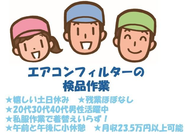 業務用エアコンフィルターの検品作業 未経験者歓迎! 作る製品が身近なものなので 何をつくるのかイメージがしやすい! 一人で黙々と作業します。 当社スタッフが活躍中! 安心してスタートできる環境です♪ □嬉しい土日休み! □残業ほぼなし! □月収23万5000円以上可能! □20~40代の男性活躍中!