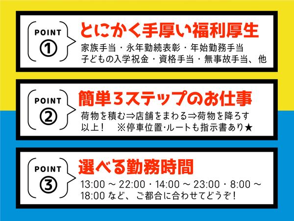 職種/仕事内容 | 仕事内容 +:-・:+:-・:+:-・:+:-・::+:-・:+:- 当センターのみ!期間限定! 入社祝い金30万円支給します! 1人で配送で10万円 半年勤務で10万円 1年勤務で10万円 :+:-・:+:-・:+:-・:+:-・::+:-・:+:- この求人のココがPOINT ■広島日野自動車のグループ会社→安定性○ ■事業拡大・組織強化のため10名以上の大募集 ■業界トップクラスの車両数&配送量! ■未経験入社大歓迎×サポート体制バツグン! ■とにかく手厚い福利厚生&安心の職場環境! —- * 電話でのご応募はコチラ↓↓ * TEL:06-6459-9100 ご質問等もお気軽にお問い合わせください! :+:-・:+:-・:+:-・:+:-・::+:-・:+:- 【 仕事内容 】 大手コンビニエンスストアへのルート配送をお願いします。 < 簡単3ステップ > ➀荷物を積む ➁店舗をまわる ➂荷物を降ろす だけ! トラックの停車位置・ルートは指示書があって安心○ 配送先でたくさん会話したりする必要もなく、接客的な要素はゼロ! 運転さえできれば年齢関係なく活躍できます。 < 詳細 > 配送物:飲料・菓子・酒・雑貨・加工食品など ※数キロ程度の軽量物多め ※全車両ドラレコ・バックカメラ完備 距離:エリア制なので短め 件数:5~6件/日※配送平均6時間 < 入社後の流れ> ➀敷地内での運転練習からスタート ...専門の指導員がレクチャーを行います。 ➁先輩の横乗り配送を体験! ...「行きは先輩が運転→帰りはあなたが運転」 のように覚えやすい環境です。 ➂慣れてきたら配送業務も独り立ち ...3ヶ月ほど先輩も一緒に手ほどきを手伝います。 【 スタッフインタビュー 】 ================ 実は運転も好きな訳じゃないし、車が好きな訳でもなく、「経験問わずやった分だけ稼げる」っていうのが良くてドライバーになったんです(笑) 僕は家庭の事情で1度退職したんですが、出戻りで復職して今も働いています。 他の会社でも働いてみたんですが、改めてこの会社の人の良さに気づき、やっぱりここで働きたいと思い、無理を聞いてもらいました。 ウチはちょっぴり世話焼きなスタッフが多く、先輩から話しかけてくれることがほとんど。見た目に似合わず色々気遣ってくれる優しい人たちです 仕事に関しては「もう大丈夫ですよ!」と突っ込むくらい心配してサポートしてくれます(笑) ギスギスした人間関係などは一切ないのでそこは安心してもらって良いと思います。 【 採用担当者より】 現在は20~30名のスタッフが活躍しており、20代~50代まで幅広く在籍しています。 中でも8割が ” 既婚者 ” で家庭持ち! ドライバーとして働く理由や当社を選んだ理由も人それぞれです 人柄を重視して採用しているので、職場の雰囲気も良いと思います。 一度、会社を覗いてみたい...という方も大歓迎! 面接時、履歴書不要なので、お気軽にご応募ください◎ ぜひ、新しい仲間をお待ちしております! ================ 【当社について】 2t・3t・4t・10tの3温度帯(冷蔵・冷凍・常温)の異なる車両を揃え、コンビニエンスストアを中心に物流・配送サービスを提供しています。 2010年には広島日野自動車(株)のグループ企業となり、さらなる事業拡大にも挑戦しています。当社HPには紹介動画や様々な取り組み実績等も記載していますので、ぜひご覧ください。 |
