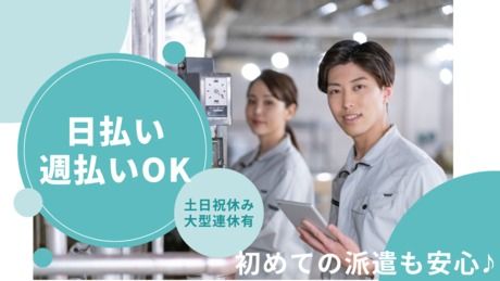 対象となる方 | 資格 製造業、工場作業員、工場内作業が初めての方もご安心ください!! 経験やスキルよりも、責任感を持って作業できる方、 あなたのお仕事に対する真摯な姿勢をしっかり評価します◎ ★未経験者歓迎・経験不問 ★無資格歓迎 ★経験者歓迎・ブランク歓迎 ★男性活躍中 ★20代/30代/40代活躍中 ★家族持ちの方も安心 ★フリーター歓迎 活躍中の先輩スタッフの前職は 軽作業スタッフ・製造・食品製造・ピッキング・ 検査・検品スタッフ・梱包・組立・ フォークリフトと様々!! 安心して長く働ける環境です。 |