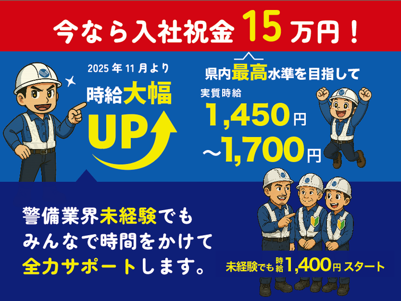 職種/仕事内容 | 仕事内容 ✤ • • • · ·· ·ココがポイント· ·· · • • • ✤ ✅2025年11月より時給ベースアップ!県内高水準! 経験者、日給12,000~13,600円! 未経験でも日給11,200円 →月収36万も可能! (月23日勤務+夜勤&お通夜警備勤務、各種手当) ✅今月入社の方は入社祝金15万円! 転職に伴う費用をバックアップ! ✅履歴書不要の就職相談も実施! 日程調整も柔軟対応◎ お仕事の後でもOK! お気軽にご相談ください。 ✅手当を大幅追加!! たくさん出勤した人、新人に教育してくれた人等、頑張った人達を評価できる制度を設けました。 (社歴手当、精勤手当、育成手当等) ✅多様性の時代!あなたらしさを尊重! 髪色や髪型、ネイル・ピアスなどの就業時の規則を緩和。 一定の基準はありますが、自由な髪型髪色、ネイルでお仕事できます♪ ✤ • • • · ·· · • • • ✤• • • · ·· · • • • ✤ <具体的なお仕事> 電気工事に伴う道路上での 車、人の交通誘導業務をお任せします。 現場へは、会社出勤後に1チーム社用車1台で移動します。 勤務地は福井市内・坂井市・あわら市がメインです。 車や自転車、歩行者の安全を守る大切なお仕事。 その分やりがいもバツグンです! 少しでも気になる方は、 ぜひお気軽にご応募ください!! 勤務エリア:福井市・坂井市・あわら市 <<<<アルハートで働くメリット>>>> ★ほかの警備会社より給与額が年中安定★ (少ない方でも月収25以上!月収30万円以上もOK) なぜなら・・・ ↓↓↓ 【①電気工事メインだから】 季節や天候に影響が無く、中止がほぼありません! 【②独自の給与保証制度】 8時間未満で現場が終わっても、4時間以上で1日分の給与を保証。 4時間未満でも1日分の75%の給与を保証。 【③年2回の賞与あり!】 【④年に1回、昇給審査がある。】 【⑤交通誘導2級資格者は月額1万円の手当支給】 【⑥手当が2025年11月より大幅改定!】 改定後最大3万円UP! 【⑦通常日勤の後にお通夜警備などで+αの収入も可能。】 (お通夜警備は2hで3,500円のお給与) ~~在職中・ご検討中の方へ~~~ ・入社日相談OK ・応募前のお仕事相談OK ・仕事帰りやご希望の日時で面談OK お気軽にご相談ください。 お電話やWEBにて受付中! |