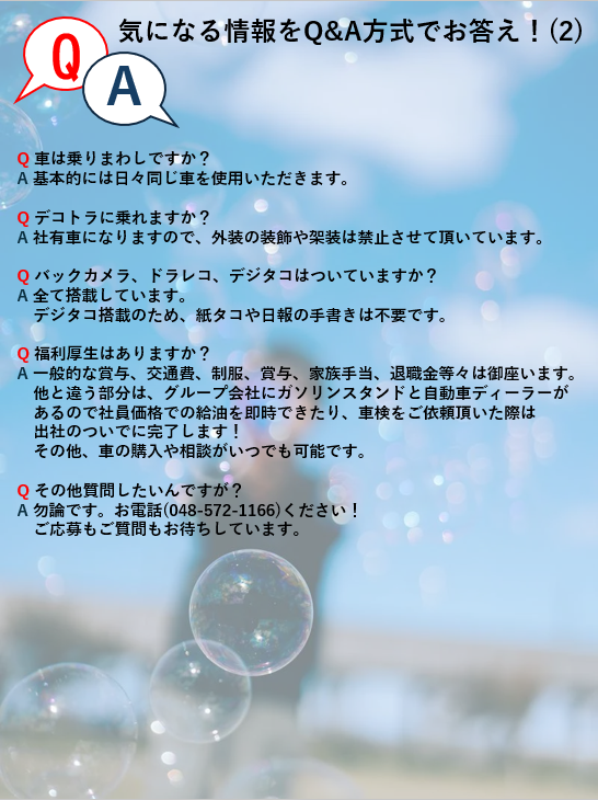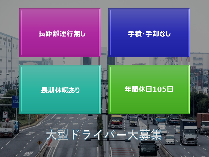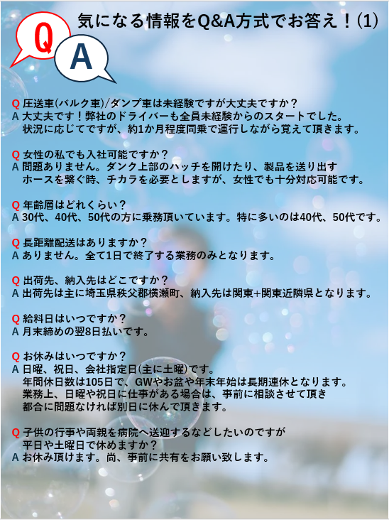 職種/仕事内容 | 仕事内容 \\ 正社員大型ドライバー大募集// 「長距離運行なし!」「手積/手卸なし!」 「長期休暇あり!」「年間休日105日!」 出荷・納入先での待機や作業が少ないんです =働きやすい環境で定着率も高い職場です= <仕事内容> セメントや石灰の圧送車(バルク車)配送 又は、ダンプ車配送をお任せします *手積・手卸がないため、体の負担は少なく どなたでも長く勤められます! 【配送エリア】 配送エリアは関東一円。 *短・中距離配送で2日運行等は一切なし! 全て当日終了です。 【出発時間目安】 基本どれかの配送に従事頂きます。 面接時にご希望を確認の上で決定致します。 ・セメント(バルク車)配送 出勤時間目安 :朝4時~6時 ・石灰(バルク車)配送 出勤時間目安 :夜0時~3時 ・石灰(ダンプ車)配送 出勤時間目安 :夜2時頃 【気になる内容 Q&A 】 Q 圧送車(バルク車)/ダンプ車は未経験 ですが大丈夫ですか? A 大丈夫です!弊社のドライバーも全員 未経験からのスタートでした。 状況に応じてですが、約1か月程度 同乗で運行しながら覚えて頂きます。 Q 女性の私でも入社可能ですか? A 問題ありません。ダンク上部のハッチを 開けたり、製品を送り出すホースを 繋ぐ時、チカラを必要としますが 女性でも十分対応可能です。 Q 年齢層はどれくらい? A 30代、40代、50代の方に乗務頂いて います。特に多いのは40代、50代です。 Q 長距離配送はありますか? A ありません。 全て1日で終了する業務のみとなります。 Q 出荷先、納入先はどこですか? A 出荷先は主に埼玉県秩父郡横瀬町 納入先は関東+関東近隣県となります。 Q 給料日はいつですか? A 月末締めの翌8日払いです。 Q お休みはいつですか? A 日曜、祝日、会社指定日(主に土曜)です。 年間休日数は105日で、GWやお盆や年末 年始は長期連休となります。 業務上、日曜や祝日に仕事がある場合は 事前に相談させて頂き、ご都合に問題 なければ別日に休んで頂きます。 Q 子供の行事や両親を病院へ送迎するなど したいのですが平日や土曜で休めますか? A お休み頂けます。 尚、事前に共有をお願い致します。 Q 車は乗りまわしですか? A 基本的には日々同じ車を使用します。 Q デコトラに乗れますか? A 社有車になりますので、外装の装飾や 架装は禁止させて頂いています。 Q バックカメラ、ドラレコ、デジタコは ついていますか? A 全て搭載しています。 デジタコ搭載のため、紙タコや日報の 手書きは不要です。 Q 福利厚生はありますか? A 一般的な賞与、交通費、制服、賞与 家族手当、退職金等々は御座います。 他と違う部分は、グループ会社にガソリン スタンドと自動車ディーラーがあるので 社員価格での給油を即時できたり、車検を ご依頼頂いた際は出社のついでに完了! その他、車の購入や相談がいつでも可能。 Q その他質問したいんですが? A 勿論、お電話(048-572-1166)ください! ご応募もご質問もお待ちしています。 <ここがポイント!> *未経験OK・ブランクOK *手積み・手卸なし *長期休暇あり *年間休日105日 *研修制度充実 *資格取得支援制度あり(規定) *通勤交通費支給 *年2回の賞与制度 *退職金制度あり(規定) *大手企業と取引多数の安定企業 <当社の強み> 創業から72年の当社。 Gマーク(安全性優良事業所)認定に加え 大手上場メーカーの元請企業に属しており 業績及び仕事量共に安定してます。 その他、多岐にわたるグループ会社(※) を有し、地域に根差した安定企業です。 ※ガソリンスタンド、ゴルフ場 三菱自動車ディーラー、病院 |