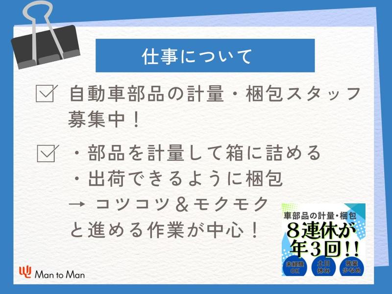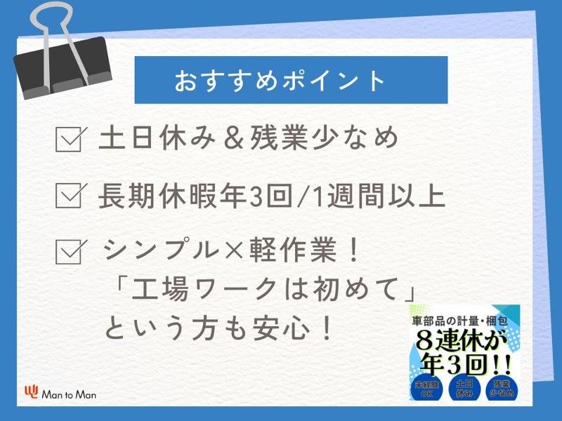 アピールポイント: 自動車製品の計量・梱包スタッフ/車通勤OKの無料駐車場あり◎