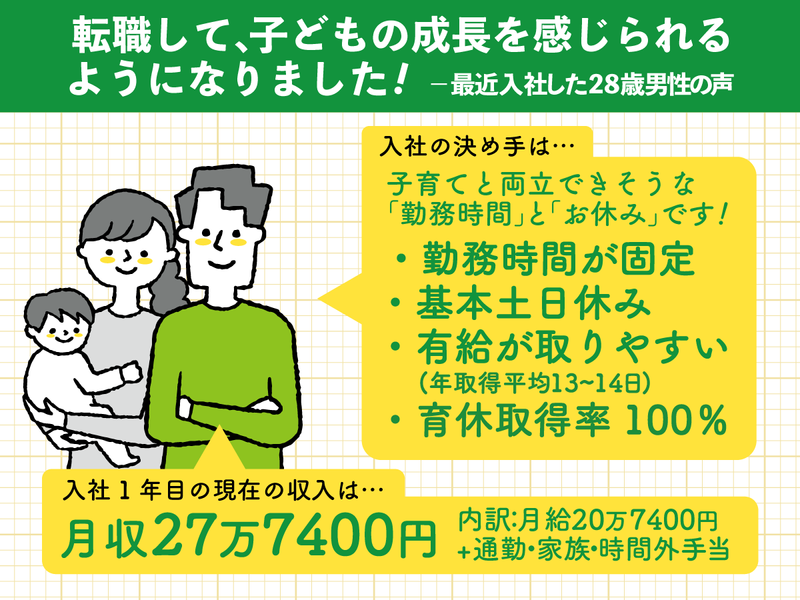 休日休暇 | 休日休暇 週休2日制/土曜・日曜 ※年2回土曜日出勤あり (健康診断・業態全体会議のため) 【年間休日】115日 【有給休暇】10日 ※上記は入社半年後の付与日数 ※平均取得日数13~14日 【長期休暇】夏季休暇・冬季休暇 【特別休暇】 *慶弔休暇 *介護休暇 *子の看護等休暇 *生理休暇 *つわり休暇 *産前産後休暇 *育児休暇 (昨年度:男性8名・女性4名取得) *配偶者出産時休暇 *産後パパ育児休暇 \男女ともに育休取得率100%/ 子育てママ・パパを全力バックアップ! 育児に集中できる、両立できる 環境づくりに注力しています! |