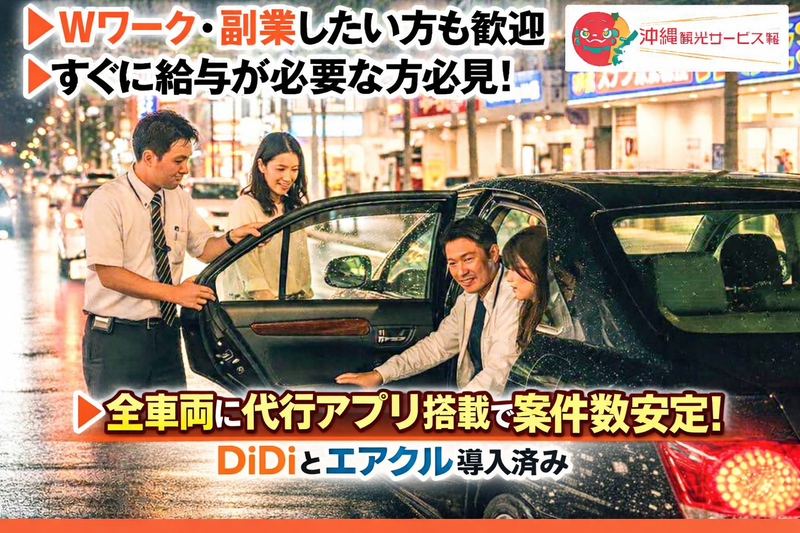 職種/仕事内容 | 仕事内容 沖縄観光サービス株式会社が運営する Car3運転代行で2種運転代行ドライバー募集! ★代行ナビ有料登録店★ 依頼数も安定しており、しっかり稼げる環境です! \日額保証&インセンティブあり/ 【安心の保証制度あり】 ・フル勤務(20:00~翌6:00) → 最低保証【9,000円】 ・6時間勤務 → 最低保証【5,000円】 ※売上が最低保証額を上回る場合は、歩合計算での支給となります。 二種免許…35%(最大40%までUPできる昇給制度有) 運転が困難になったお客様の車を、 随伴ドライバーと2人1組で 目的地までお届けする運転代行業務です。 【主な仕事内容】 ✅お客様の送迎 ✅同行ドライバー(随伴車)との連携 ✅お客様対応 (乗車時の確認/料金案内/鍵の受け渡し等) 代行アプリ「DiDi」と「エアクル」を 全車両に搭載しているため、 継続的に案件を獲得できる環境です。 ■対応件数目安 平日:7〜10件程度 金土・祝前日:10〜20件程度 \最低保証もあるので安心してスタートできます!/ 【日額7,000円〜12,000円以上の報酬実績あり】 保証があるので収入面の不安なく働けます◎ 頑張り次第でしっかり稼げる環境です! ※稼働状況・件数により変動あり 【仕事の流れ】 1.お客様より予約の電話 ⇓ 2.指定された場所へ社用車にてお伺い ※2名でお伺いします ⇓ 3.ご指定の目的地まで送迎 飲酒運転による悲惨な事故を防ぐため 運転代行を通じて地域社会に貢献しながら、 しっかりと収入を得ることができます。 |