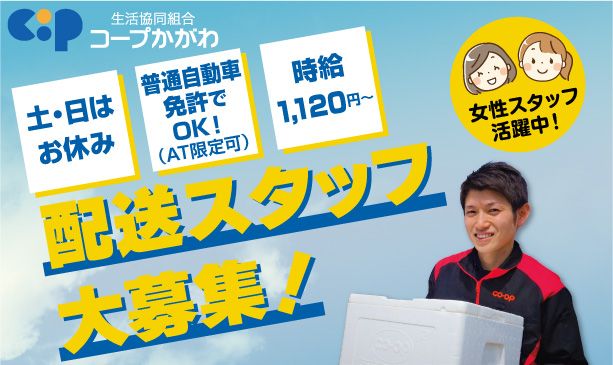メッセージ \未経験者大歓迎!/ コープ宅配ドライバー募集! 【普通車免許OK】【小型トラック】 コープの宅配ドライバーとして、 地域の方々の暮らしをサポートしませんか? 毎週決まった時間に、 同じ組合員さんへご注文の商品をお届けします。.。:+* ▶働きやすいポイント――― ・土日休みで家事とも両立OK ・時給1170円、祝日はさらに100円UP♪ ・社保完備、交通費支給、社員登用制度あり♪ ・マイカー通勤OK♪ こんな方にオススメです! ★地元で安定して働きたい方 ★普通免許を活かして働きたい方 ★子育てと仕事を両立したい方 ★未経験から新しい仕事を始めたい方 女性スタッフも多数活躍中♪▼お仕事紹介動画はこちらhttps://youtu.be/IhQpvcXVk28 組合員に商品をお届け「宅配事業」 県内14店舗「店舗事業」 暮らしに役立つ「生活・サービス事業」