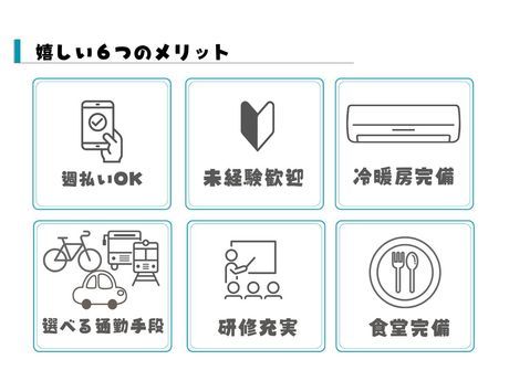 待遇・福利厚生 | 【保険制度】 雇用保険、労災保険、健康保険、厚生年金 【福利厚生】 待遇・福利厚生 【福利厚生】 ○交通費支給(2万円/月) ○車通勤OK(敷地内駐車場) ○日払い制度(毎週火・金払い) ○食堂・売店・自販機・空調完備 ○無料ウォーターサーバー完備 ○社会保険完備 ※2か月以内の短期は 雇用保険、労災保険のみ ○有給休暇 ○産前産後休暇 ○育児休暇 ○健康診断 ○正社員登用制度 |